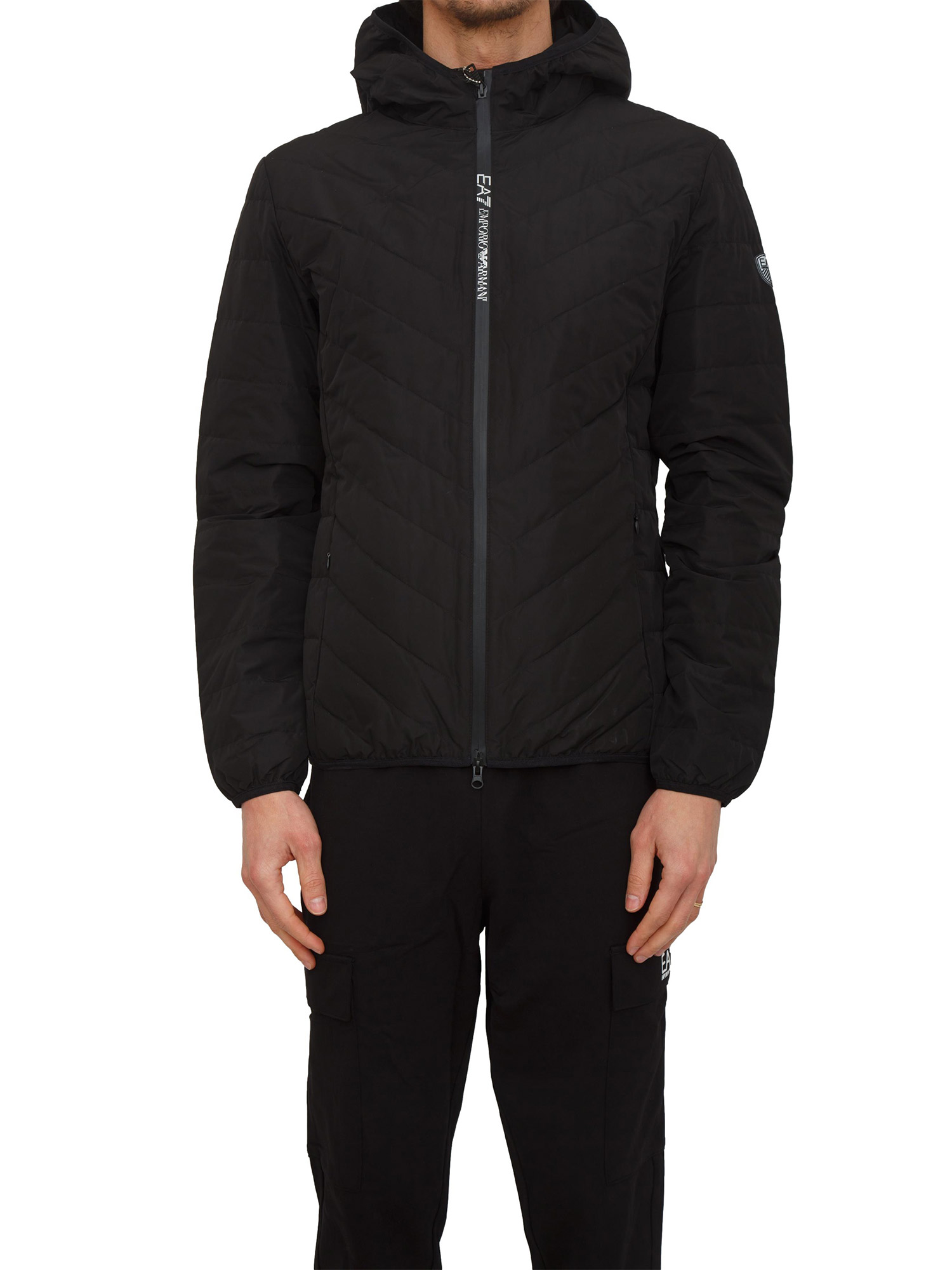 Piumino EA7 Emporio Armani con imbottitura in piuma d'oca e tessuto tecnico con motivo trapuntato effetto chevron. Il modello è dotato di chiusura frontale con zip, cappuccio fisso, due pratiche tasche laterali ed è personalizzato dal patch scudetto con logo. Il capo è packable può essere richiuso nella sua dust bag. Il modello è alto 1.90m e indossa la taglia L.