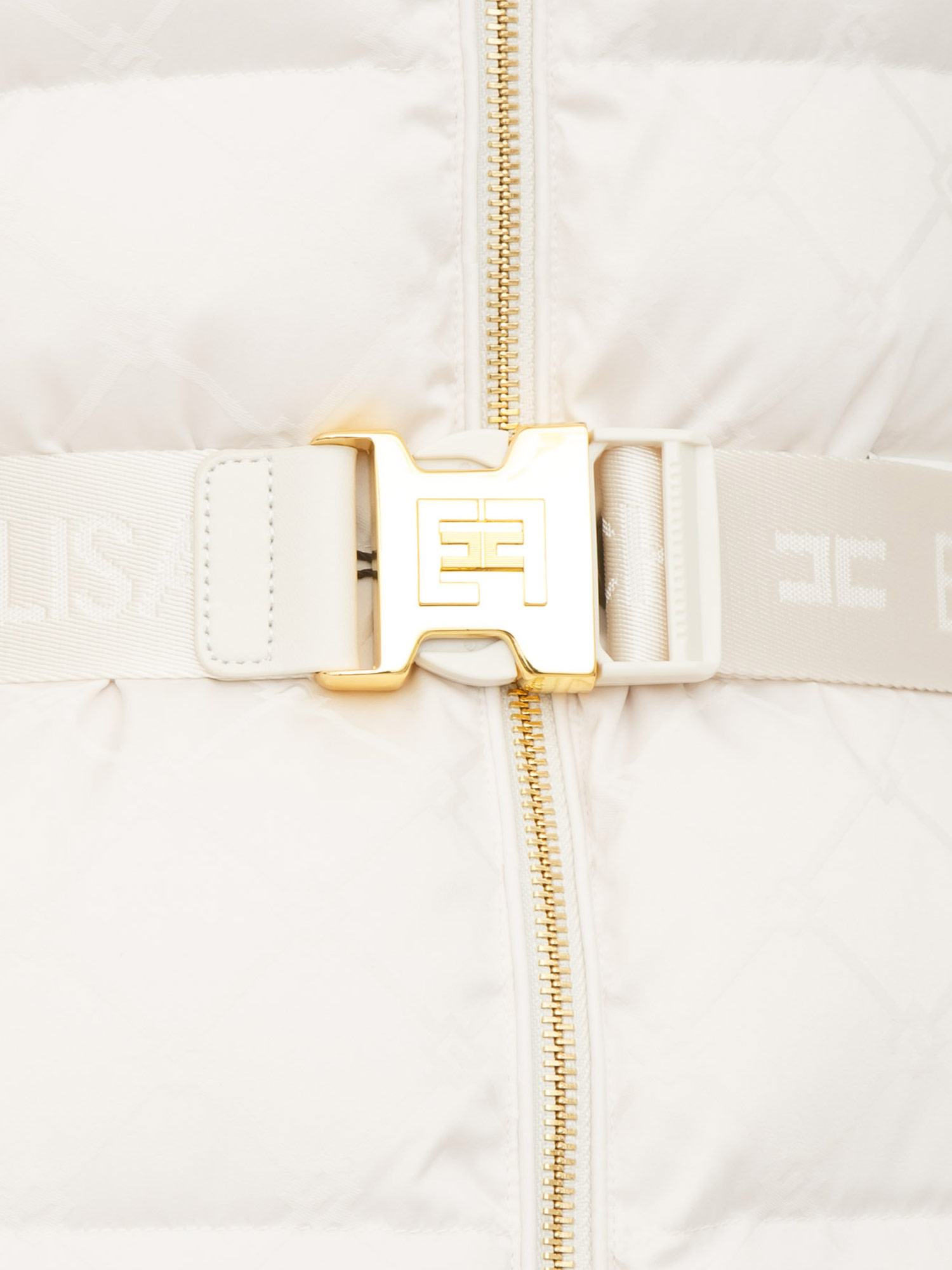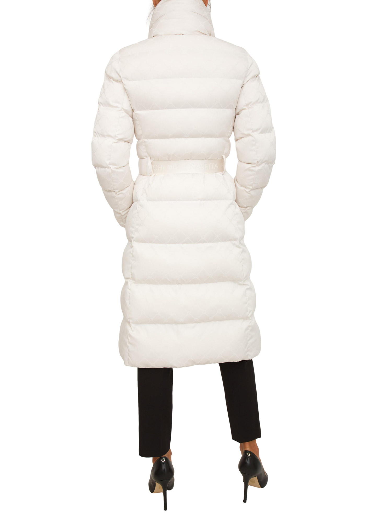 Piumino lungo Elisabetta Franchi con tessuto in vela dalla vestibilità regular. Presenta collo con sciarpa imbottita e amovibile e tasche con zip invisibile. Il pattern all-over con losanga jacquard rende la texture preziosa. Cintura in vita con fibbia per definire il punto vita. La modella è alta 1.72 e indossa la taglia 40.