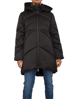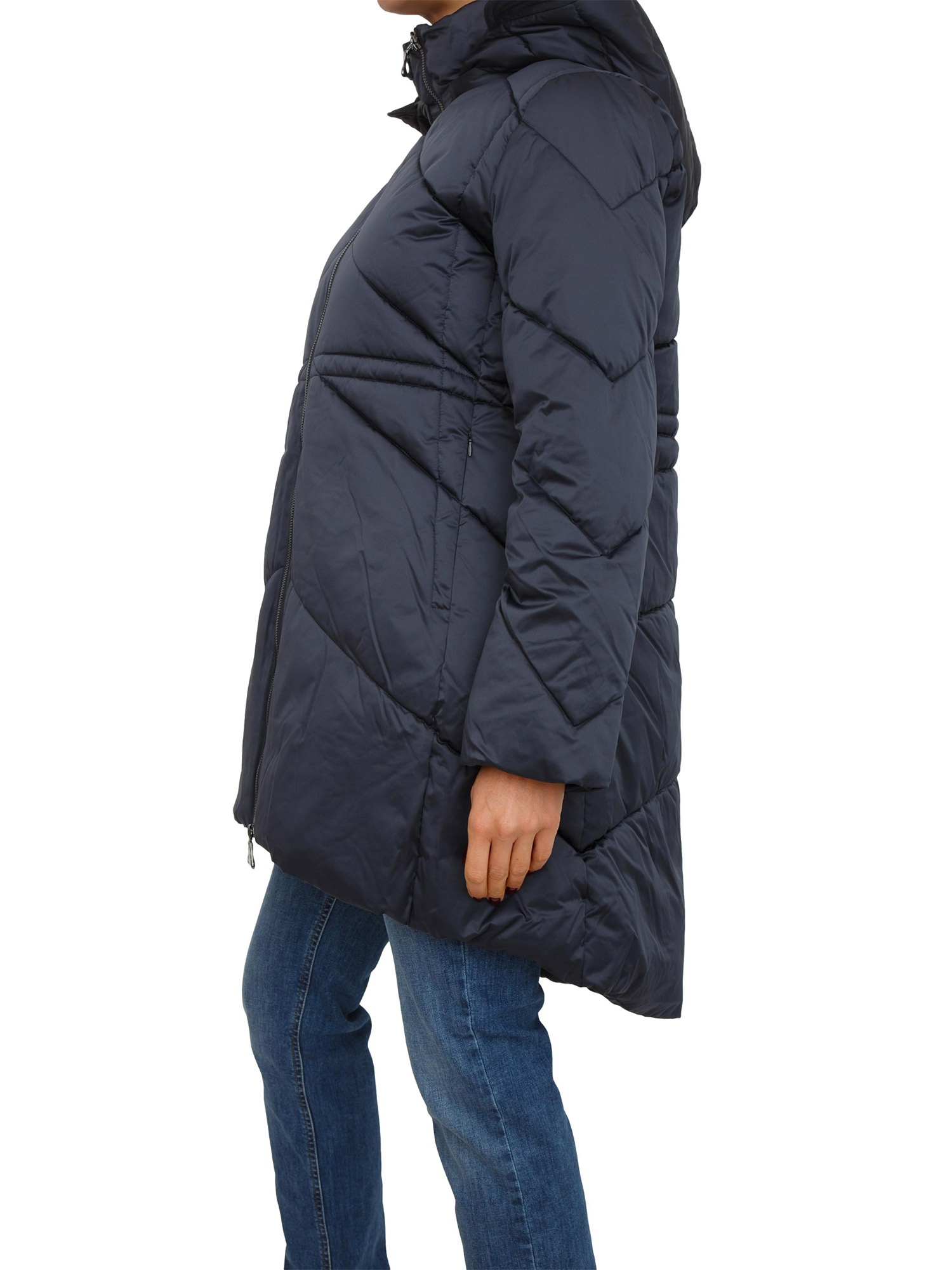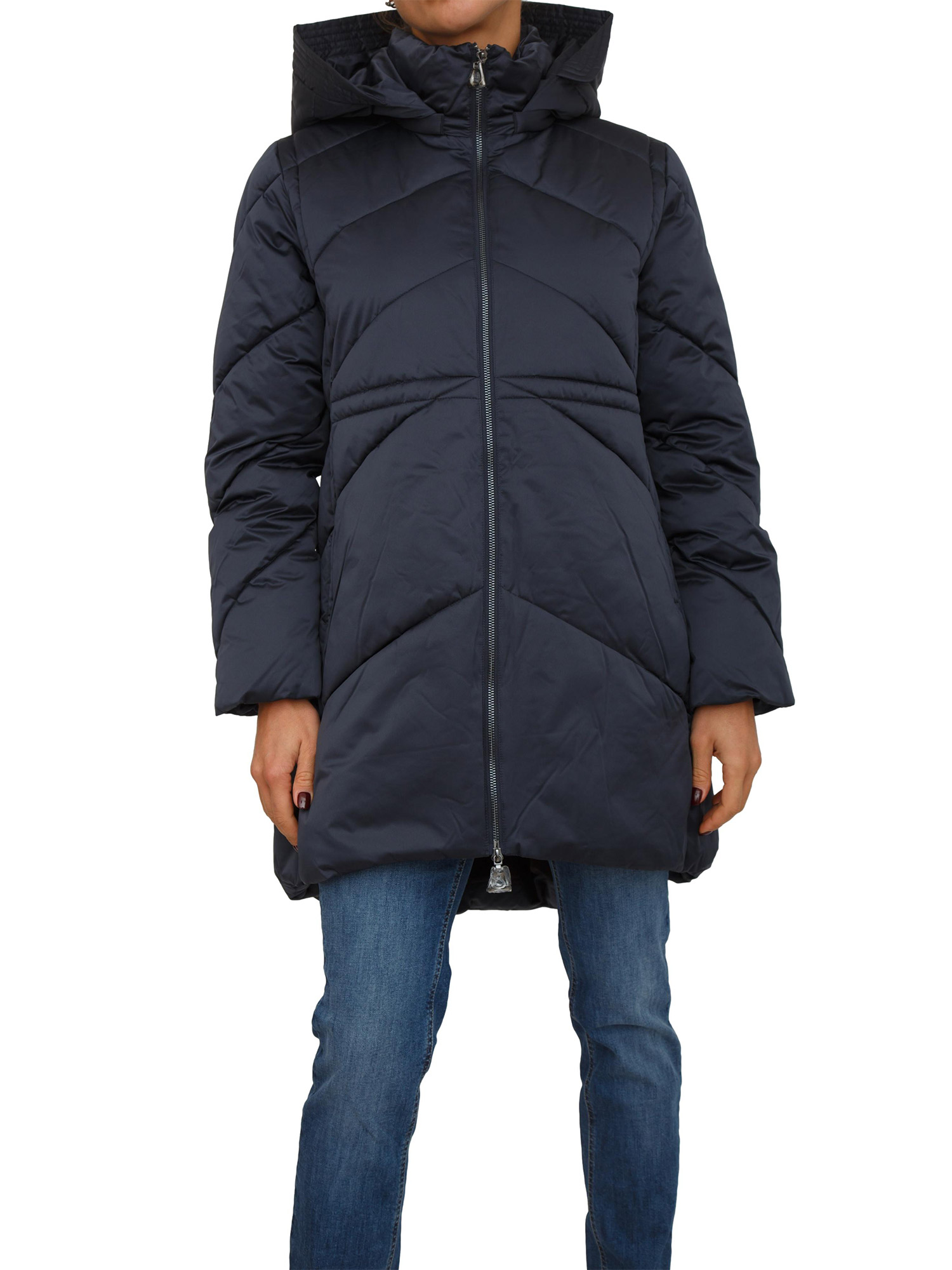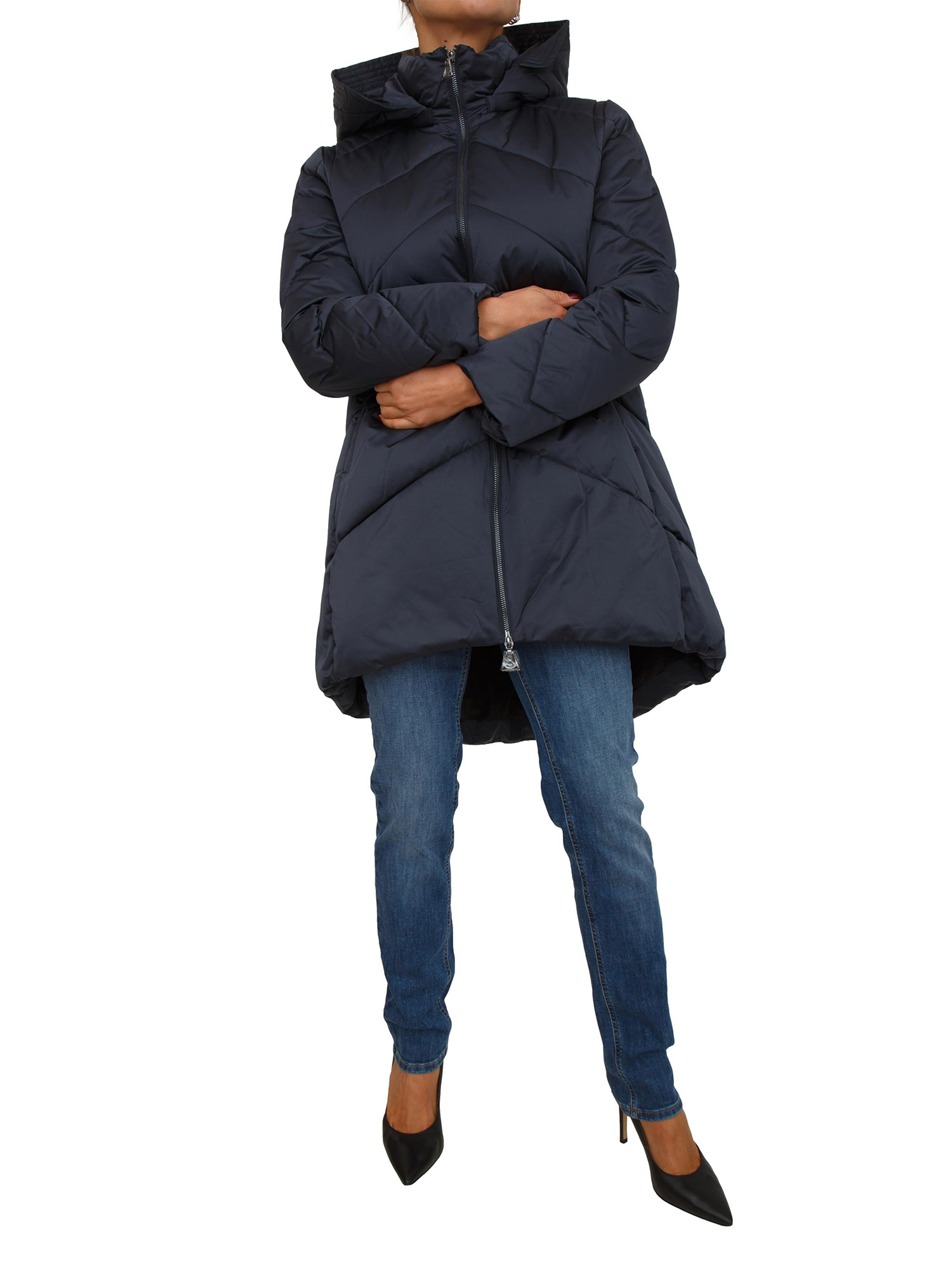 Piumino lungo donna Nenette con cappuccio in tessuto raso, morbido e luminoso. La linea avvolgente garantisce comfort e protezione, mentre la finitura elegante dona un tocco sofisticato anche ai look più pratici. La modella è alta 1.72 e indossa la taglia 40.