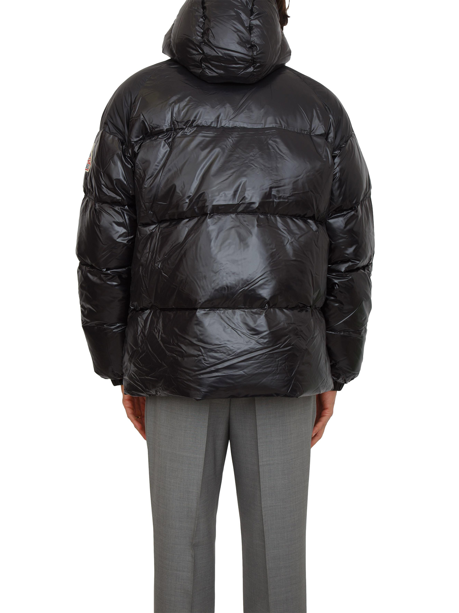 Piumino Sten Pyrenex modello unisex, stupendo revival degli anni '90, realizzato in tessuto tecnico idrorepellente e antivento con finitura lucida. Imbottito in piuma d'oca naturale con cappuccio regolabile da coulisse, full zip doppio cursore e tasche laterali. Il modello è alto 1.90m e indossa la taglia L.