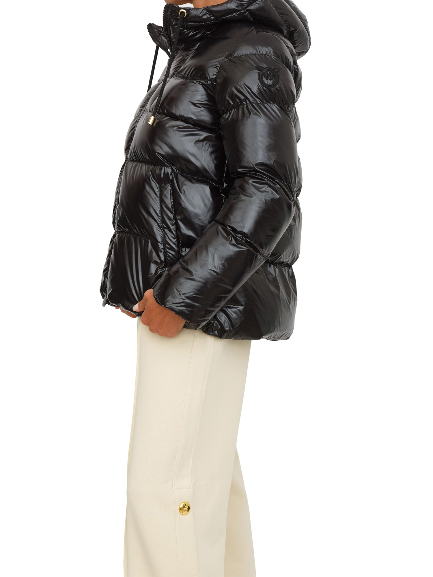Piumino Pinko modello caban in crystal nylon lucido con patch logo su una manica. Collo a cappuccio con coulisse a cordino, chiusura zip doppio cursore e tasche a filetto sui fianchi. Il capo è foderato per un maggiore comfort durante l'indosso. La modella è alta 1.72 e indossa la taglia 40.