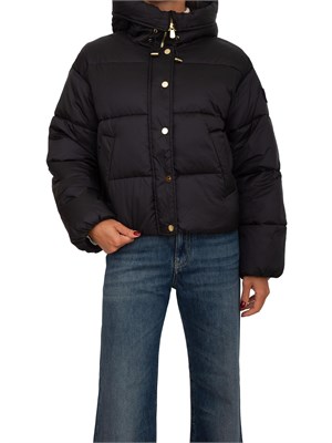 Piumino Pinko in tela tecnica con finishing semilucido. Dotato di cappuccio regolabile e di comode tasche a filetto. Chiusura con zip a doppio cursore e bottoni metallici a pressione. La modella è alta 1.72 e indossa la taglia XS.