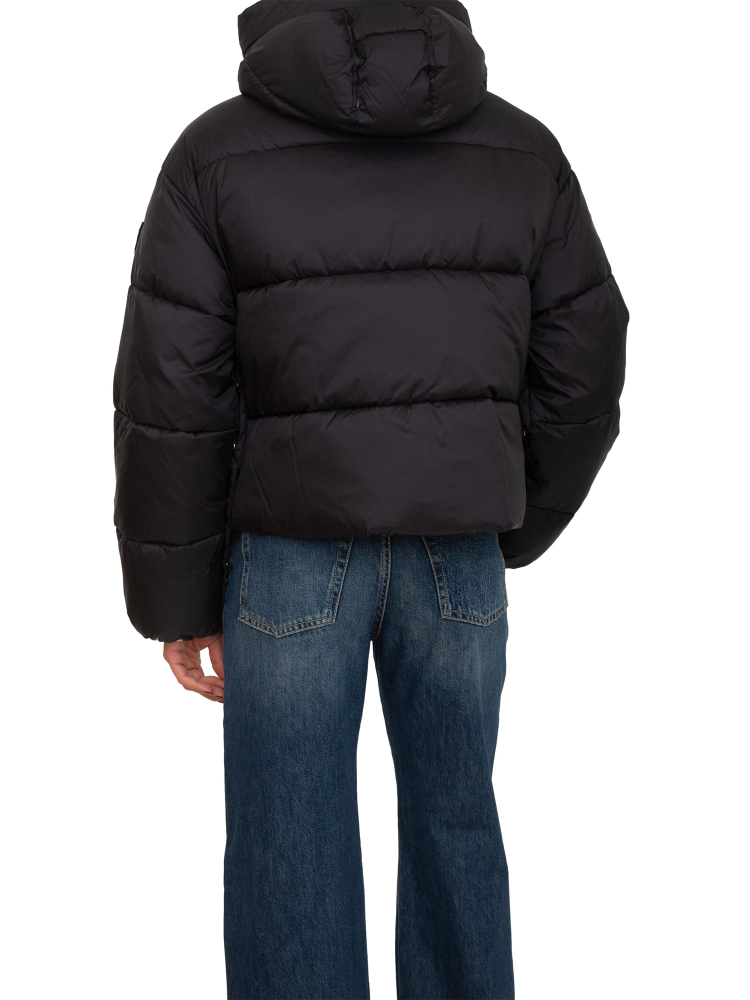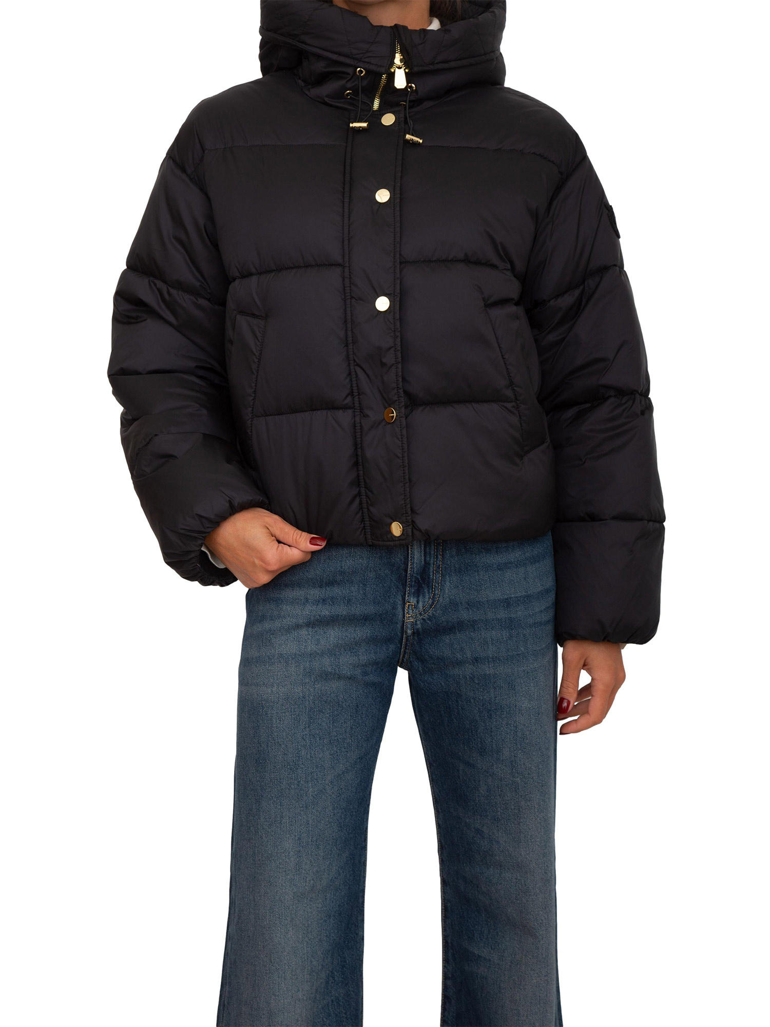 Piumino Pinko in tela tecnica con finishing semilucido. Dotato di cappuccio regolabile e di comode tasche a filetto. Chiusura con zip a doppio cursore e bottoni metallici a pressione. La modella è alta 1.72 e indossa la taglia XS.