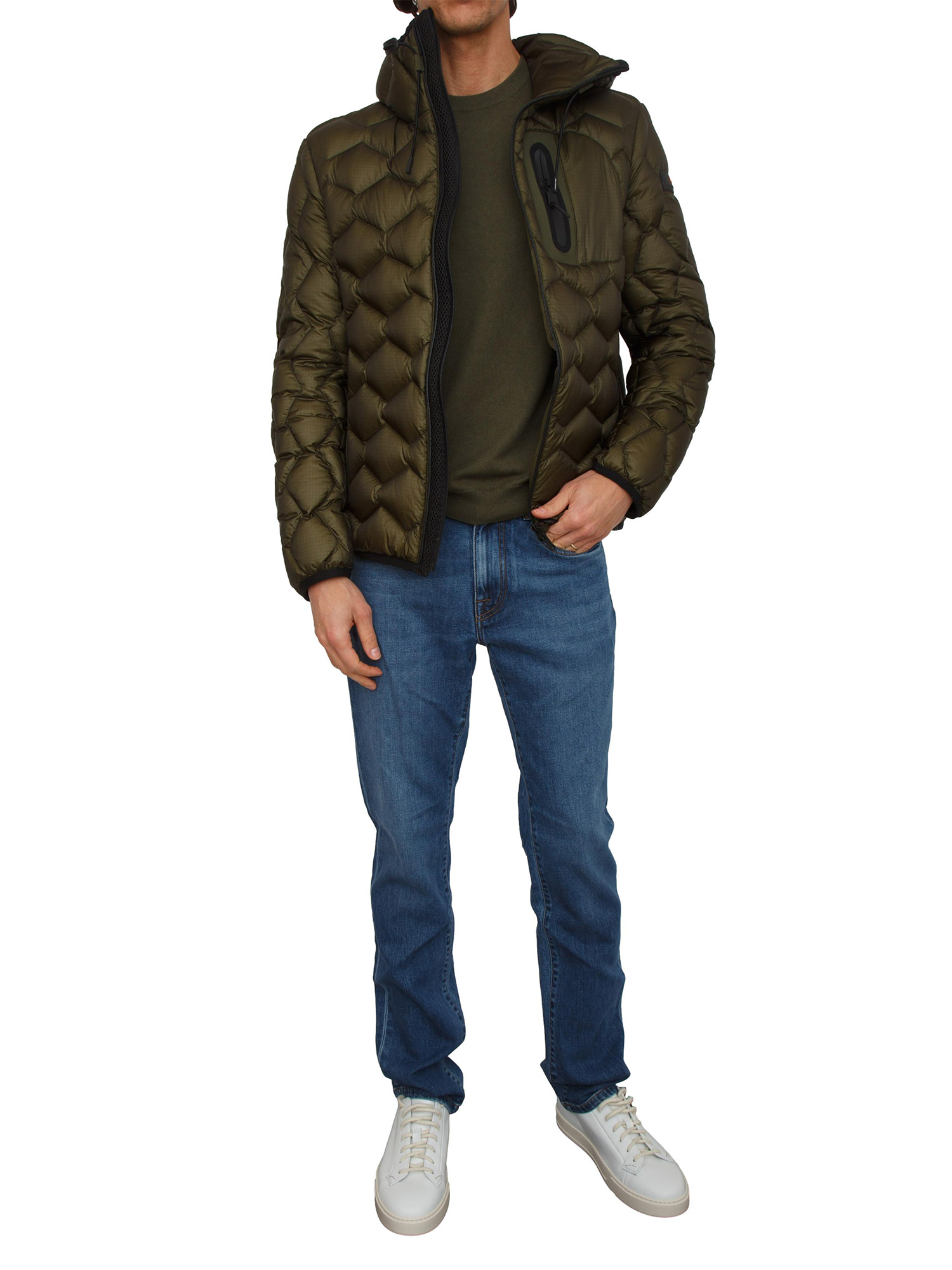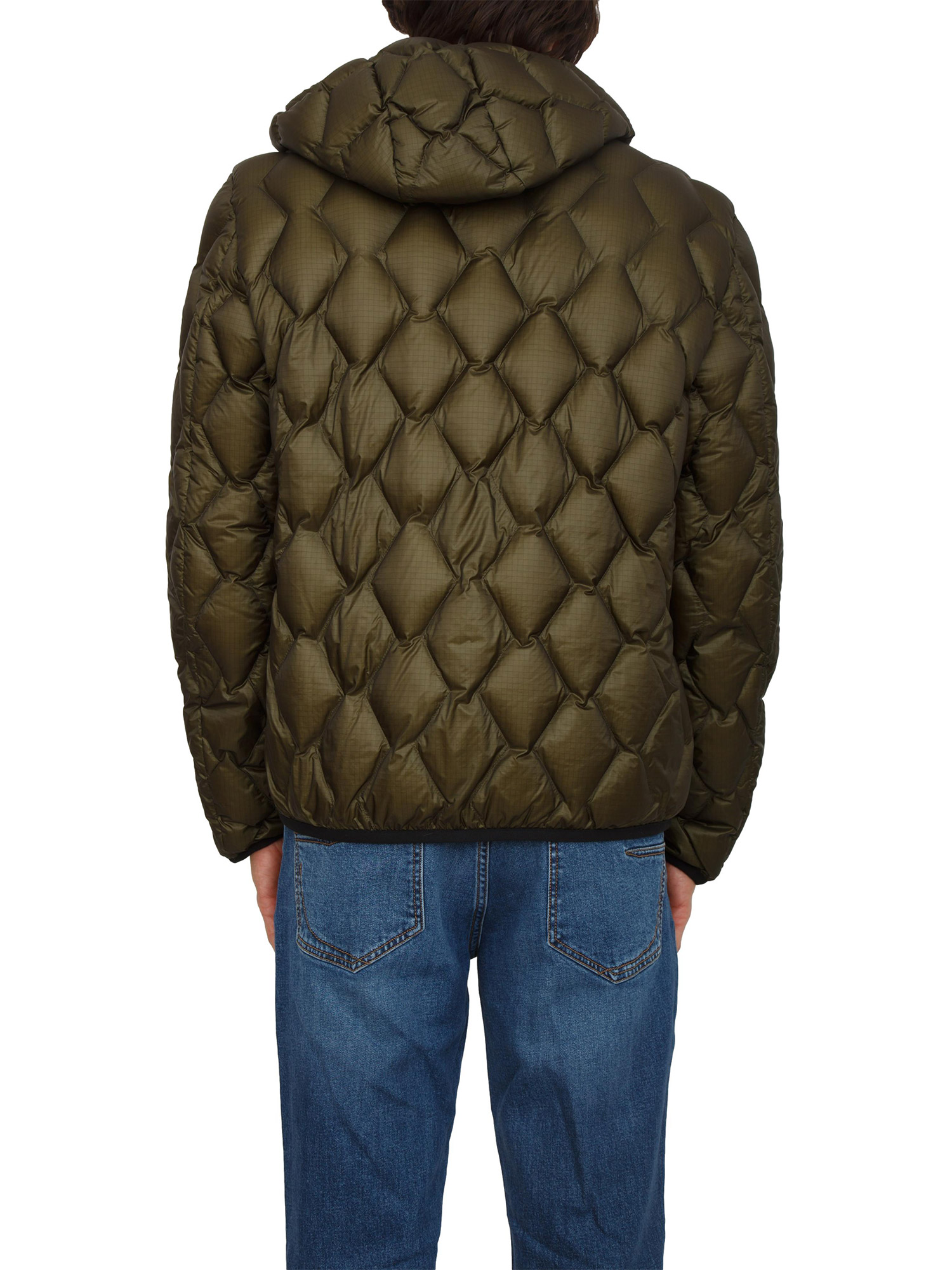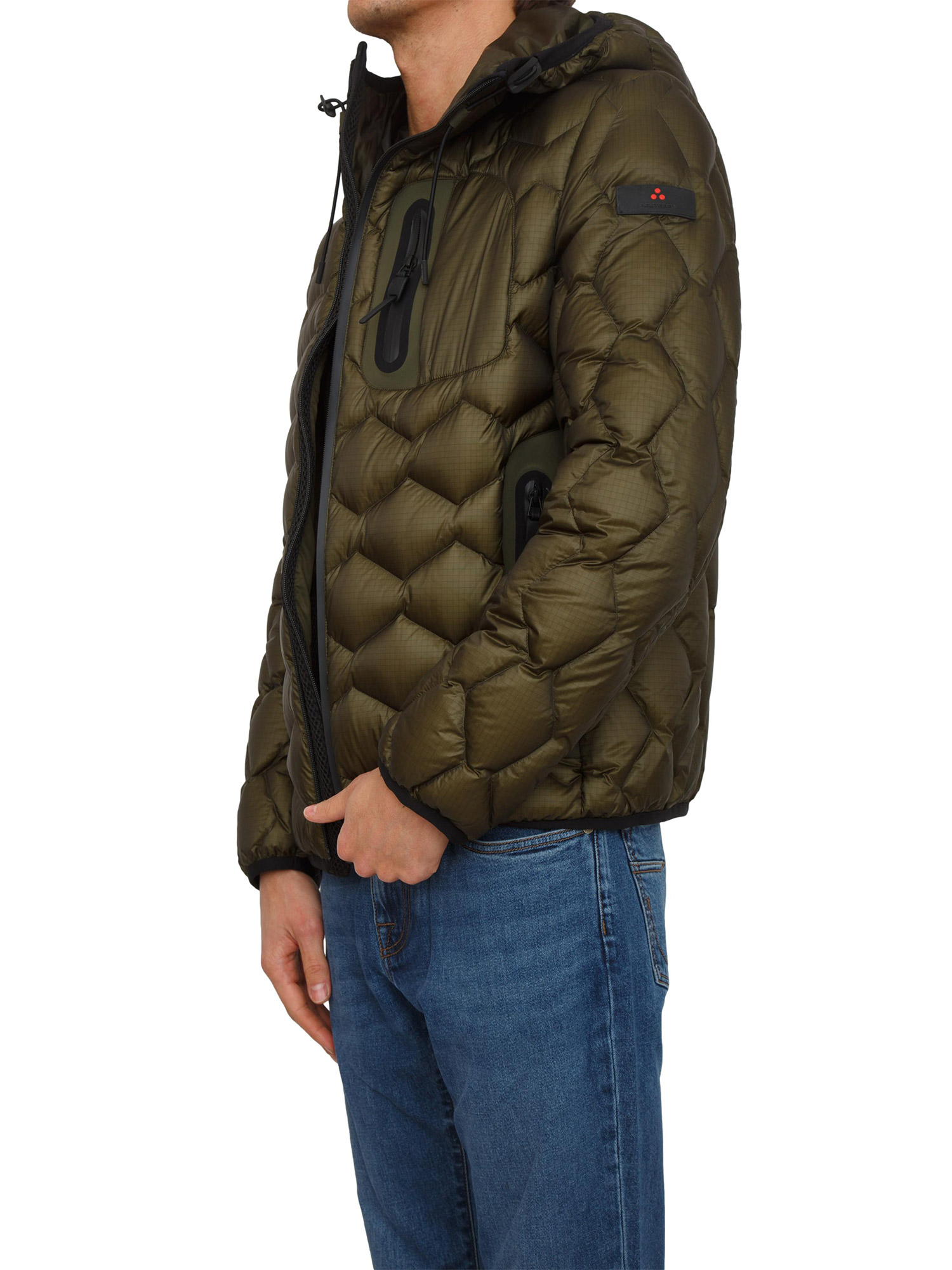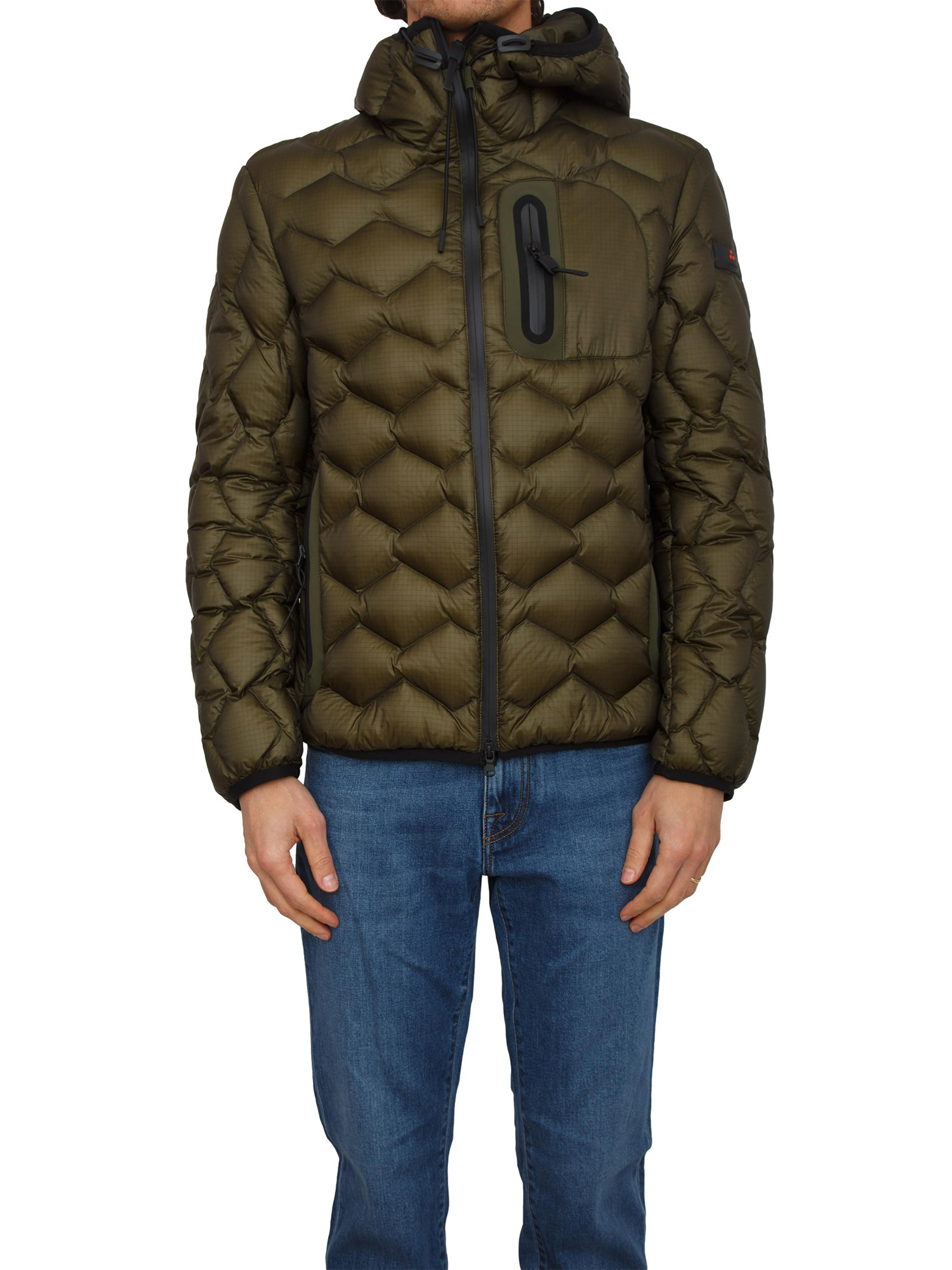 Piumino WeiWei KJ BMAT Peuterey uomo in piuma naturale certificata con trapunta a motivi geometrici in nylon ripstop 7den lucido e tela di nylon stretch multi bava. Tasche laterali a filetto con zip e tasca sul petto termosaldate per donare maggiore tecnicità al capo. Il modello è alto 1.90m e indossa la taglia L.