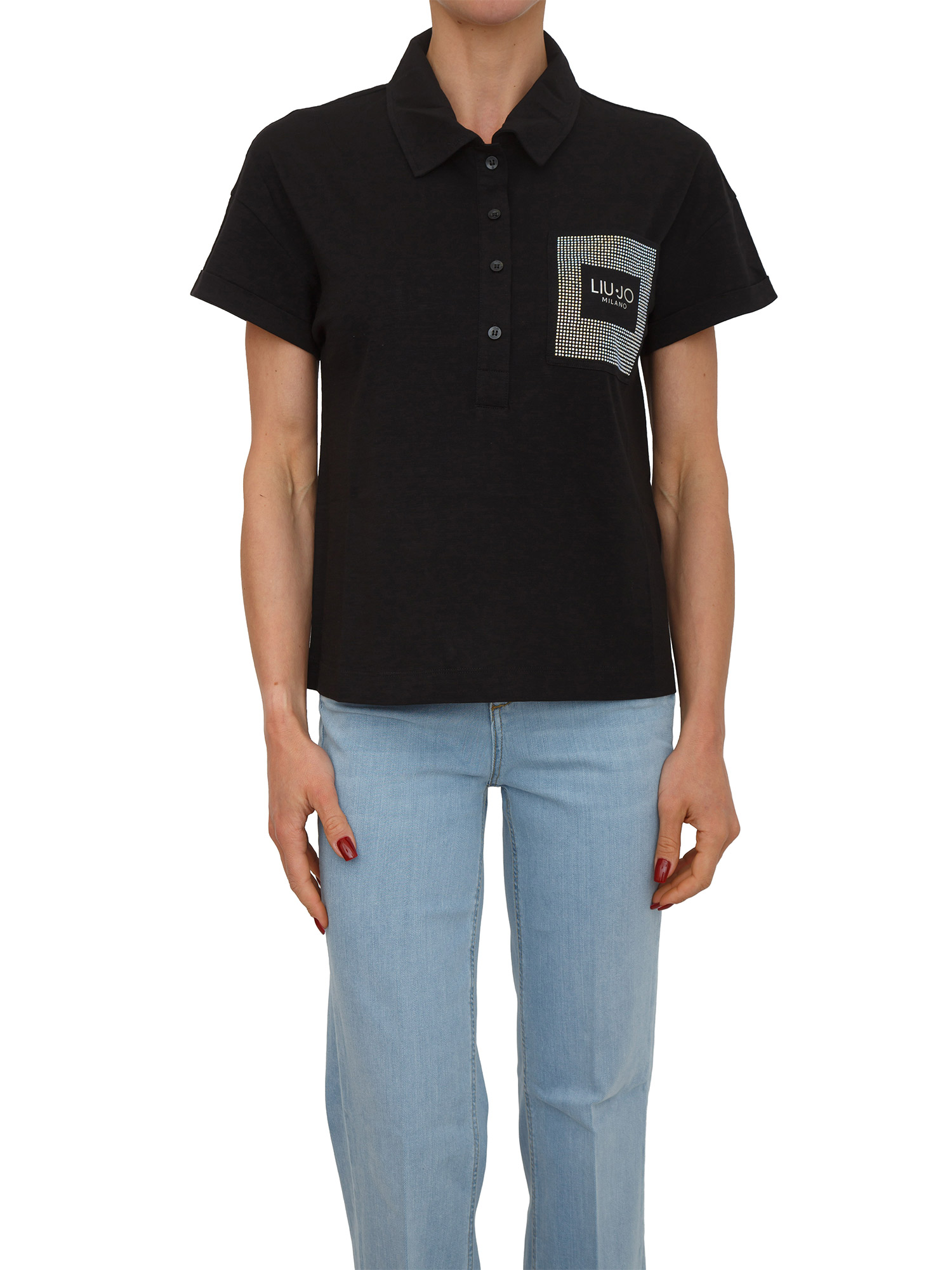 Polo Liu Jo donna realizzata in jersey di cotone con maniche corte e tasca sul petto con strass e logo. Vestibilità regular fit con chiusura a 4 bottoni.