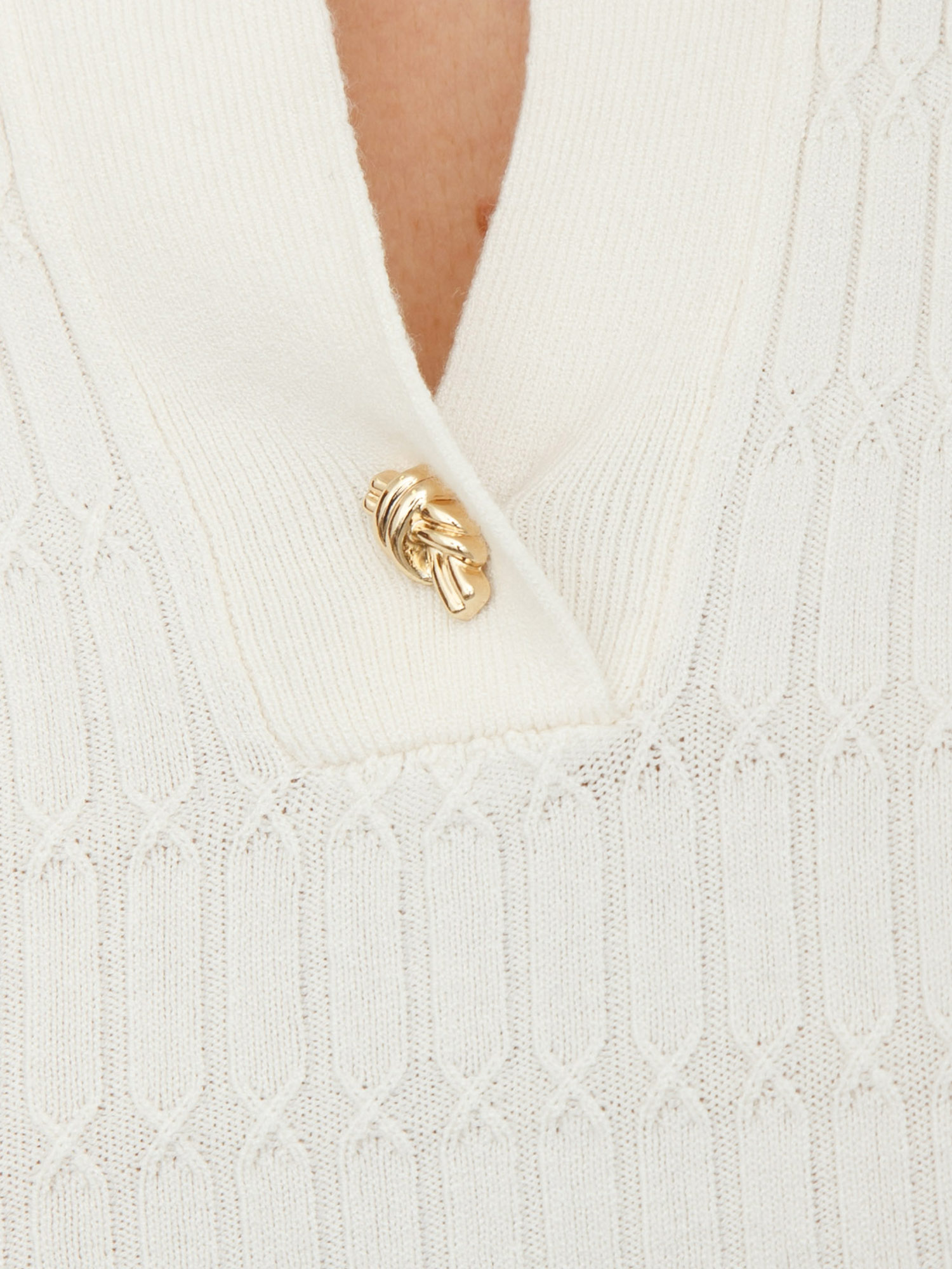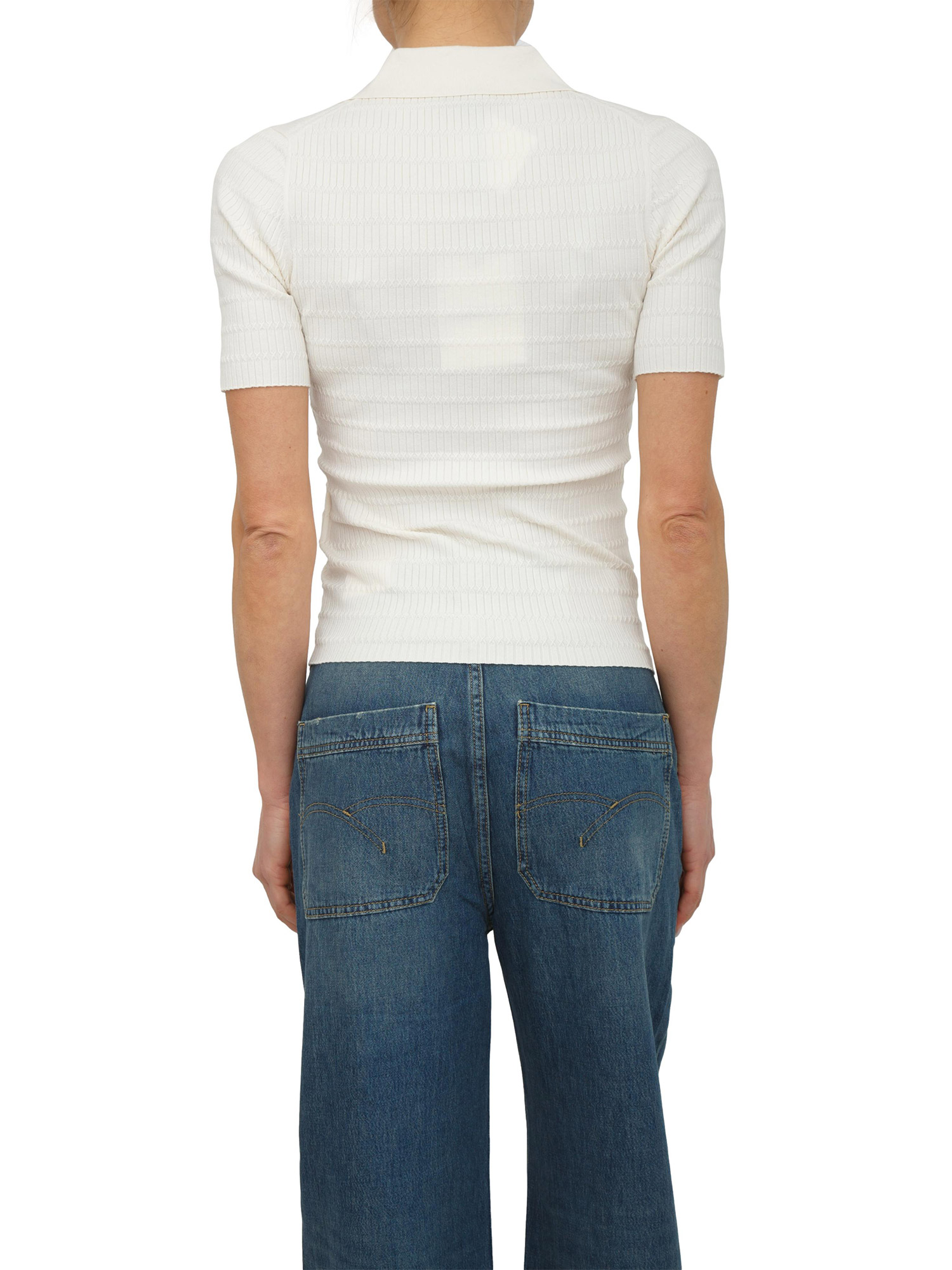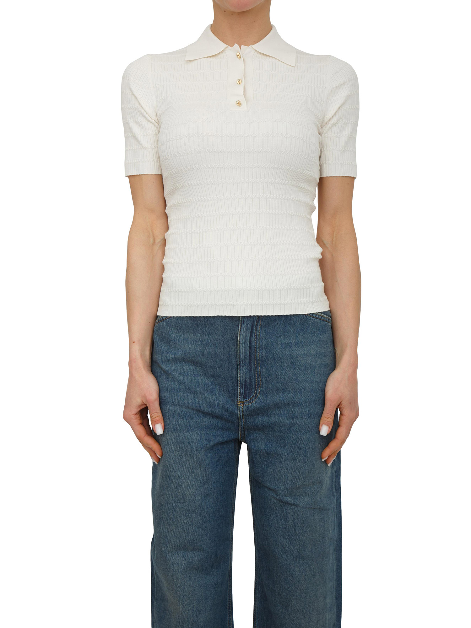 Alternativa cool alla camicia, la polo aderente MLLLEGNO Marella realizzata in misto viscosa con lavorazione a treccia è il capo versatile che completa i tuoi look. Fit aderente, collo polo con tre bottoni bijoux e lavorazione a treccia. La modella è alta 1.72 e indossa la taglia M.