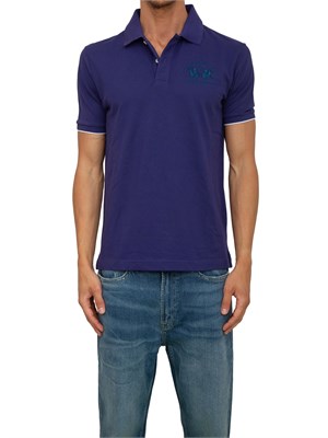 Polo uomo La Martina a maniche corte in tinta unita, realizzata in piquet stretch con vestibilità regular. Chiusura a due bottoni e nastro a contrasto applicato sull'interno collo. Il collo e i polsini sono in costina in tono. Grande logo ricamato sul petto e sotto collo con stampa scritta La Martina a contrasto. Il modello è alto 1.90m e indossa la taglia L.