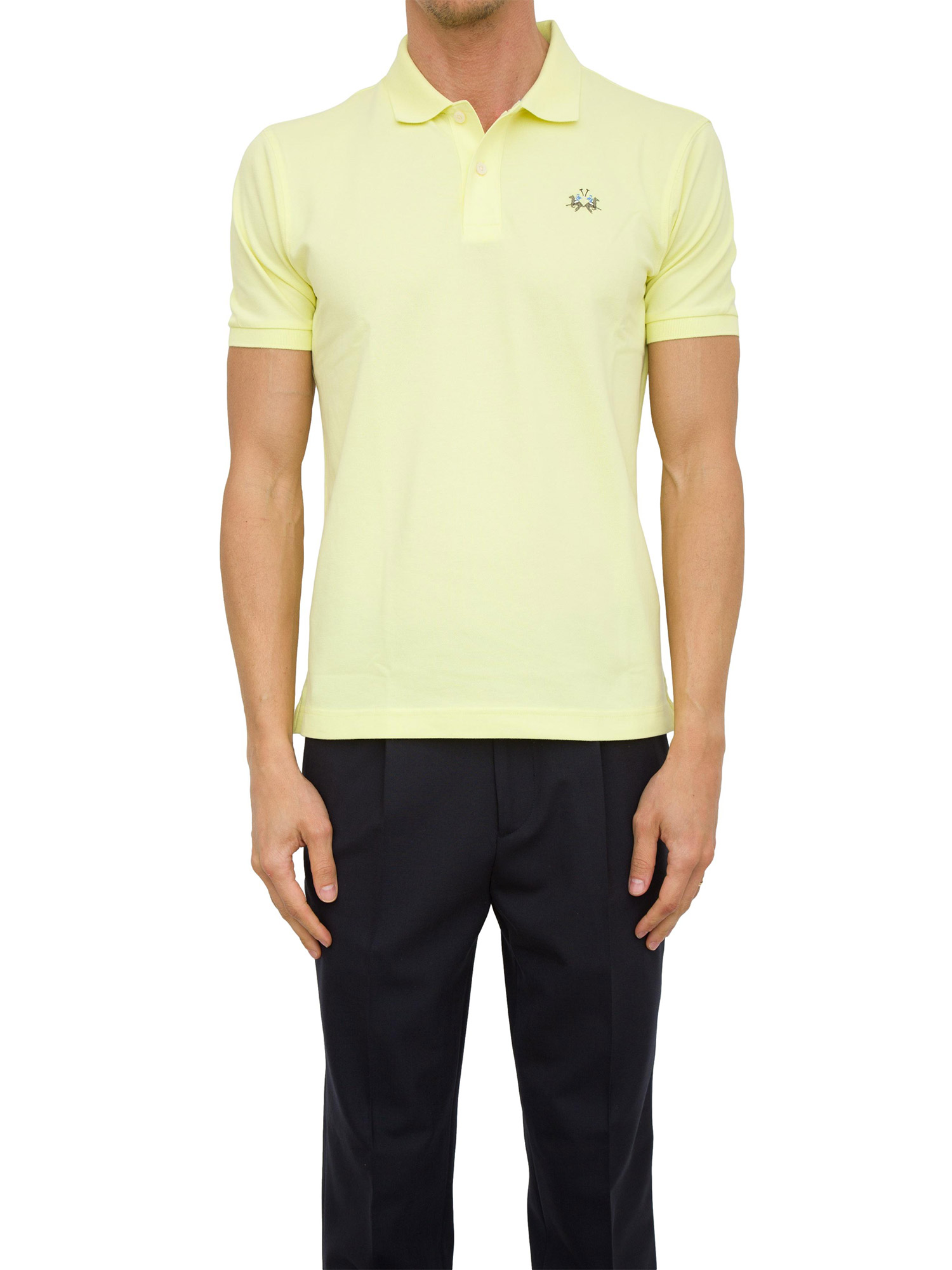Polo da uomo in tinta unita a maniche corte in cotone elasticizzato. Chiusura a due bottoni. Cuciture tono su tono. Colletto e giromanica a coste. Sotto il colletto è presente la scritta "La Martina". Il logo piccolo è ricamato sul petto. La vestibilità è slim.