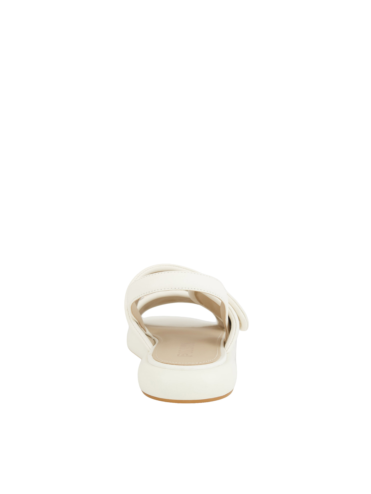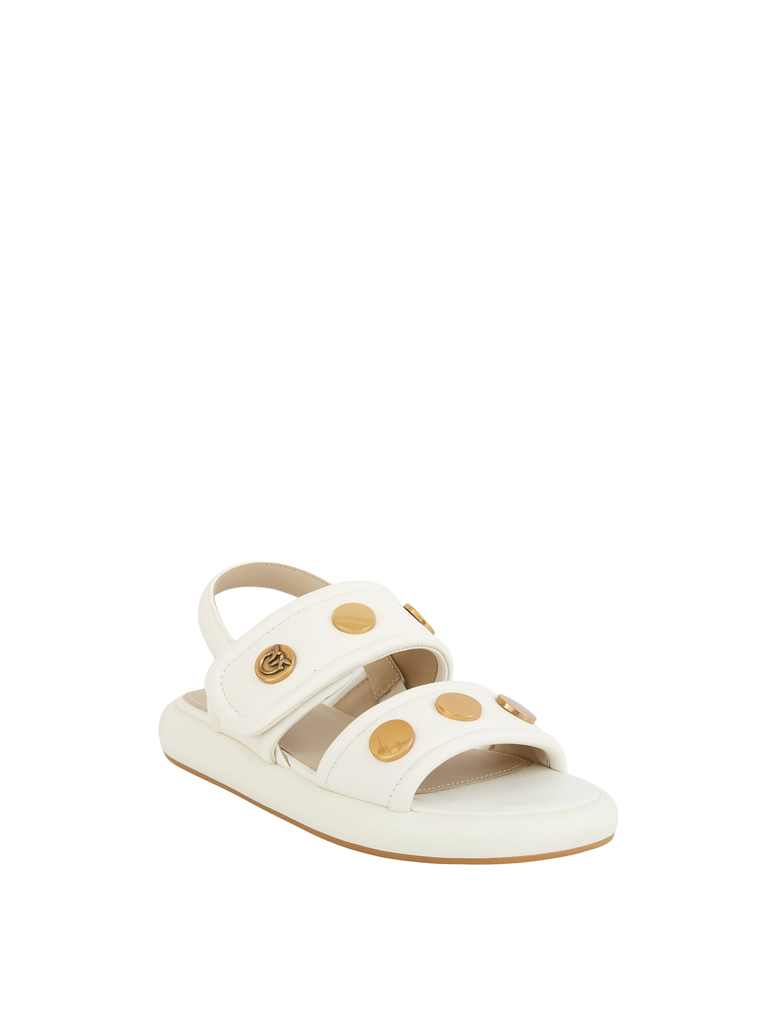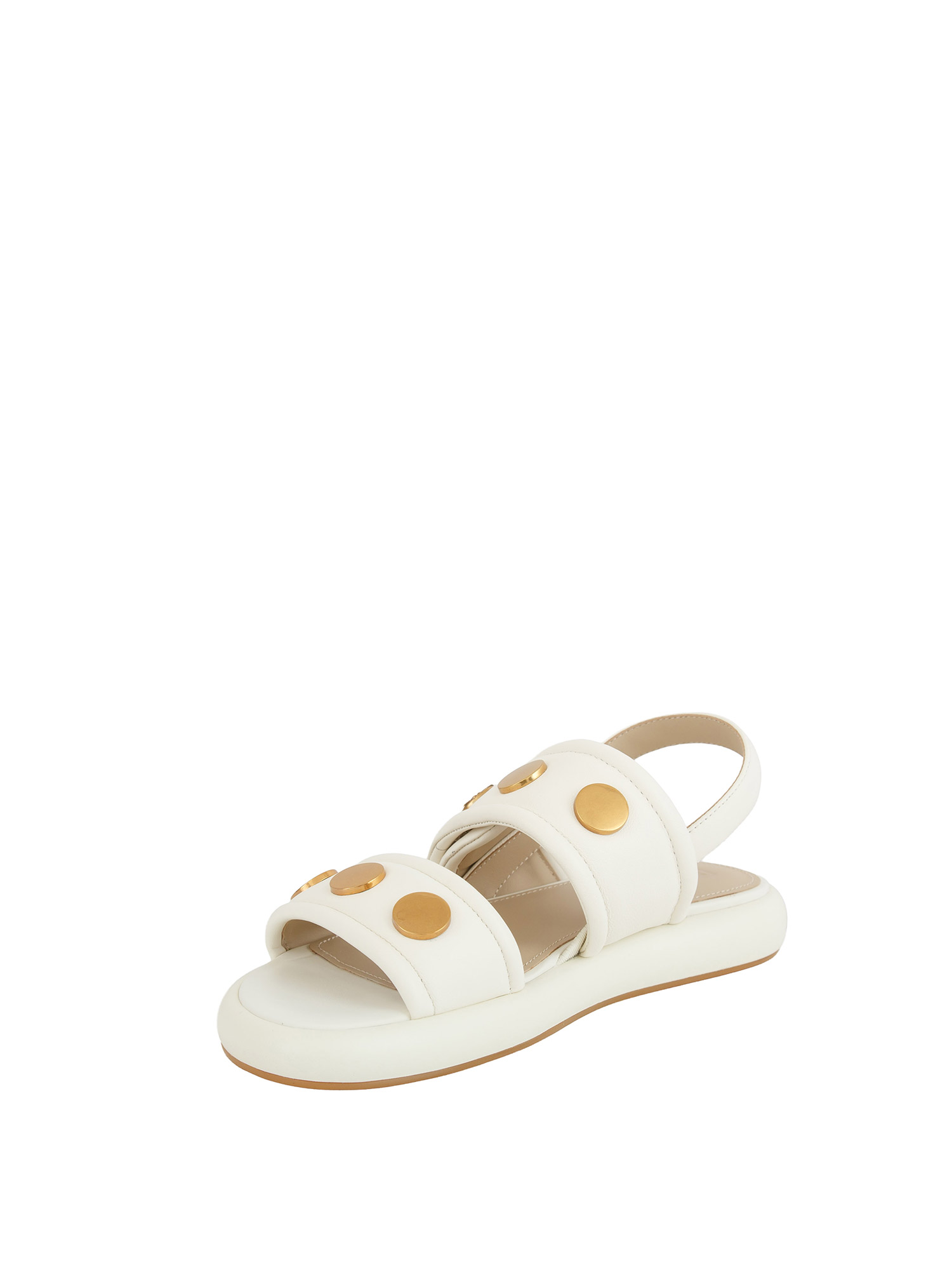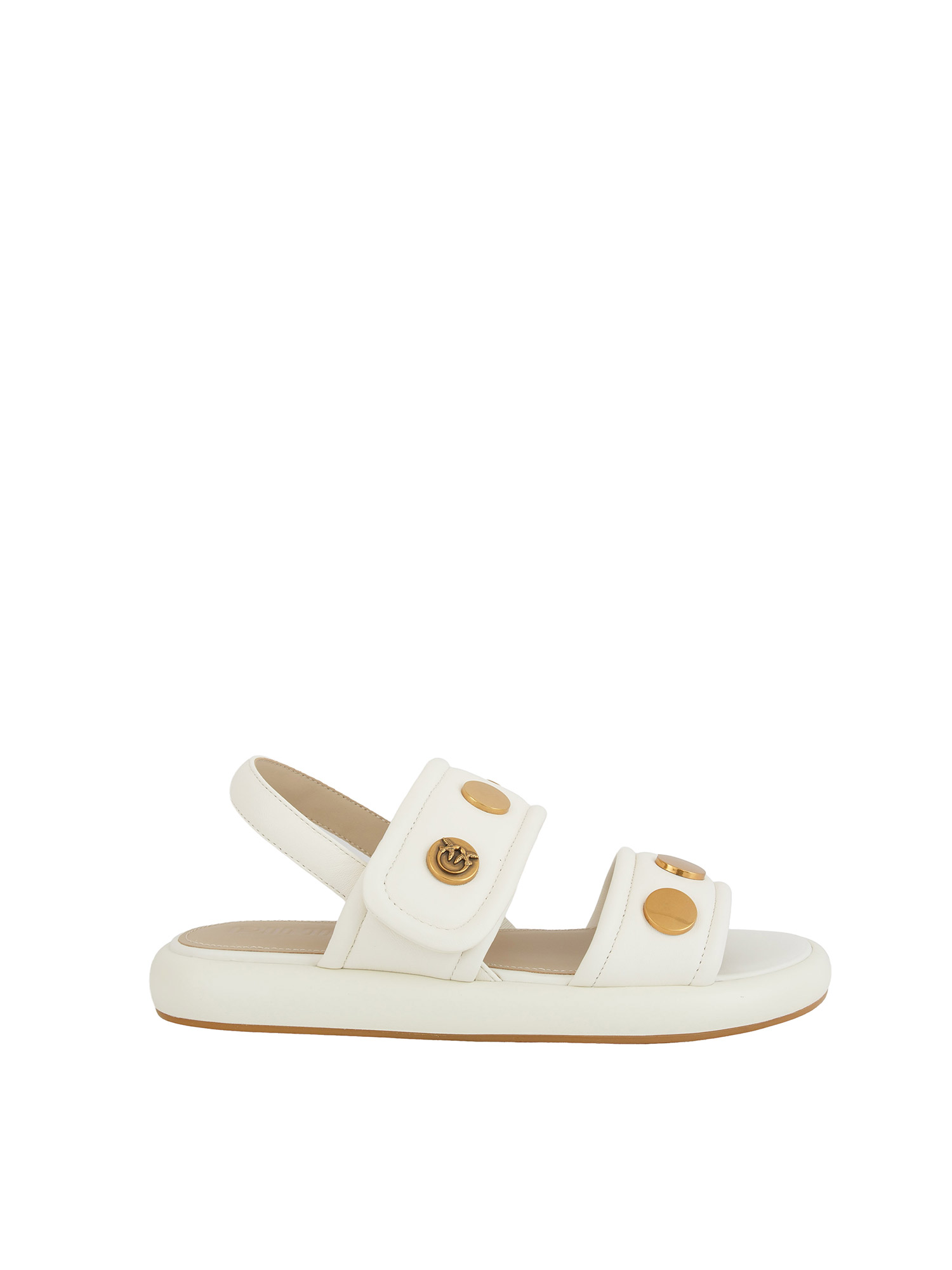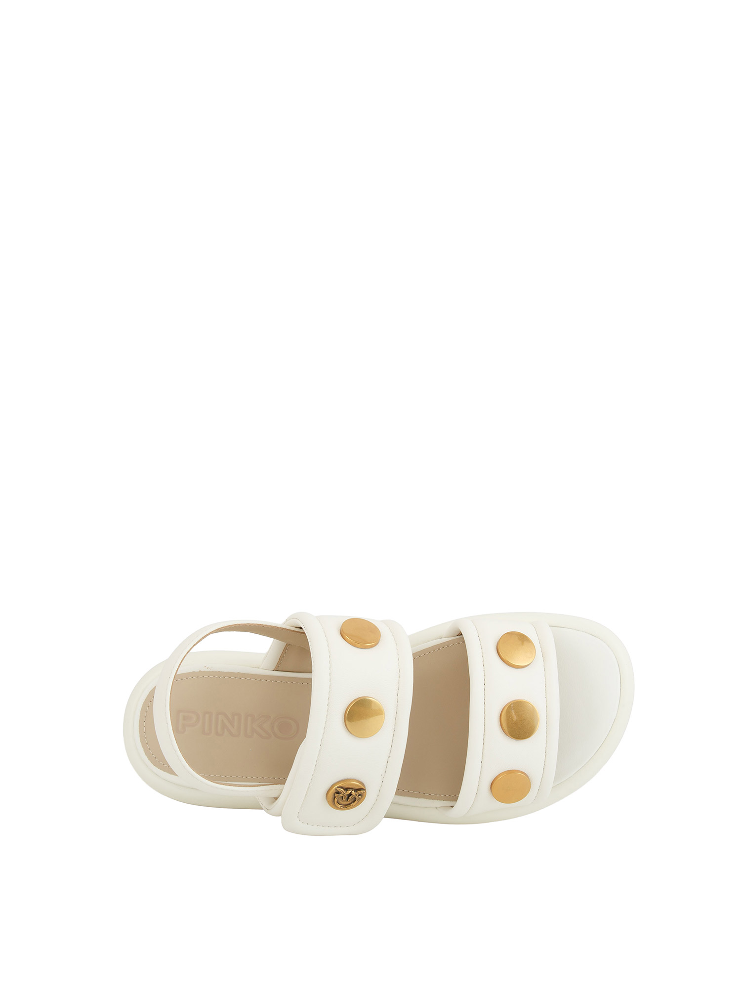 Sandali bassi Fiona Pinko in morbida nappa caratterizzati da due voluminose fasce superiori imbottite e decorate da applicazioni metalliche tonde e piatte, di cui una rifinita dal logo Love Birds per un tocco riconoscibile. Il modello, dotato di una suola ergonomica in gomma dal profilo chunky.