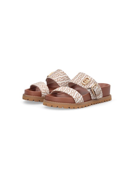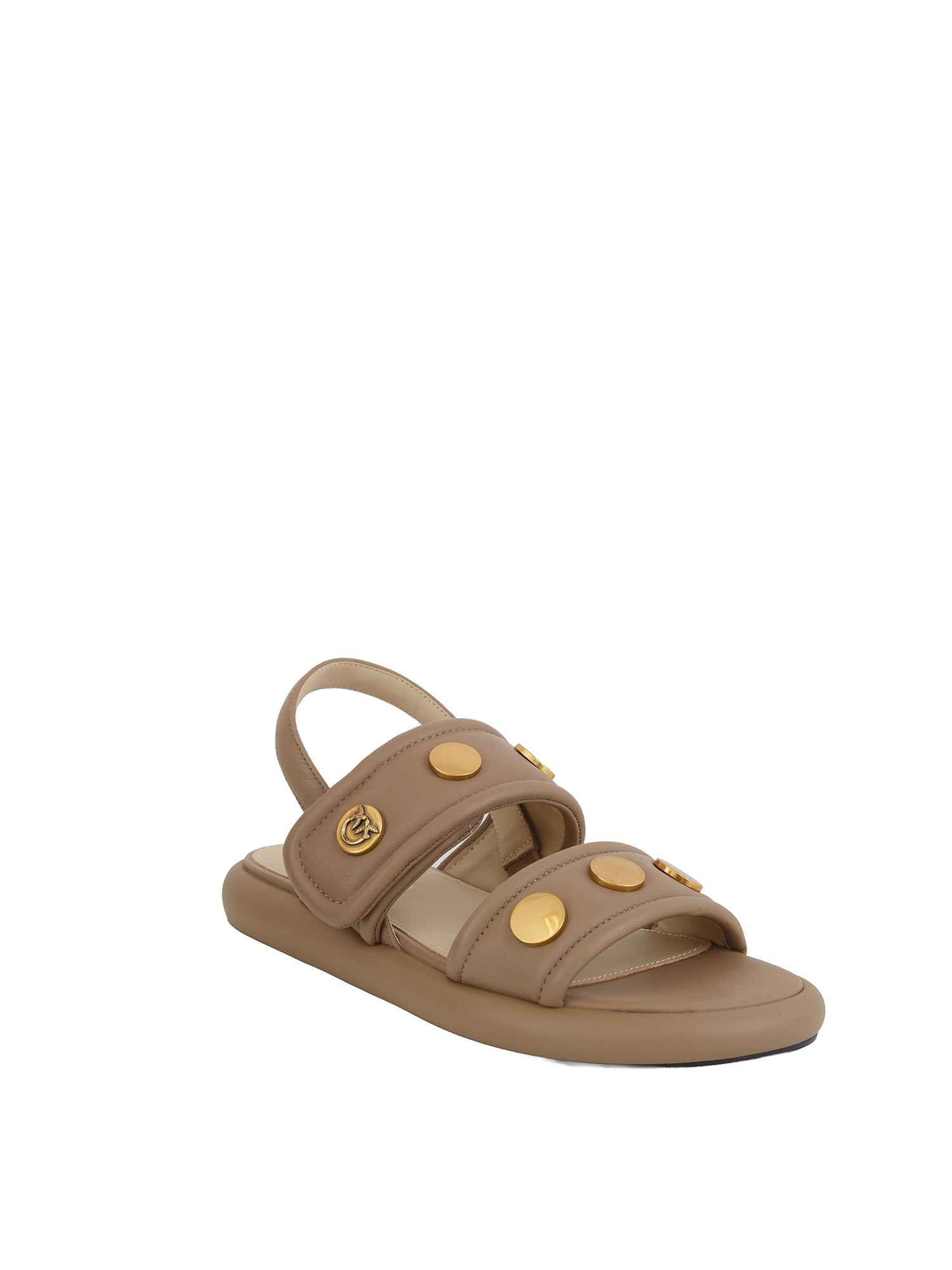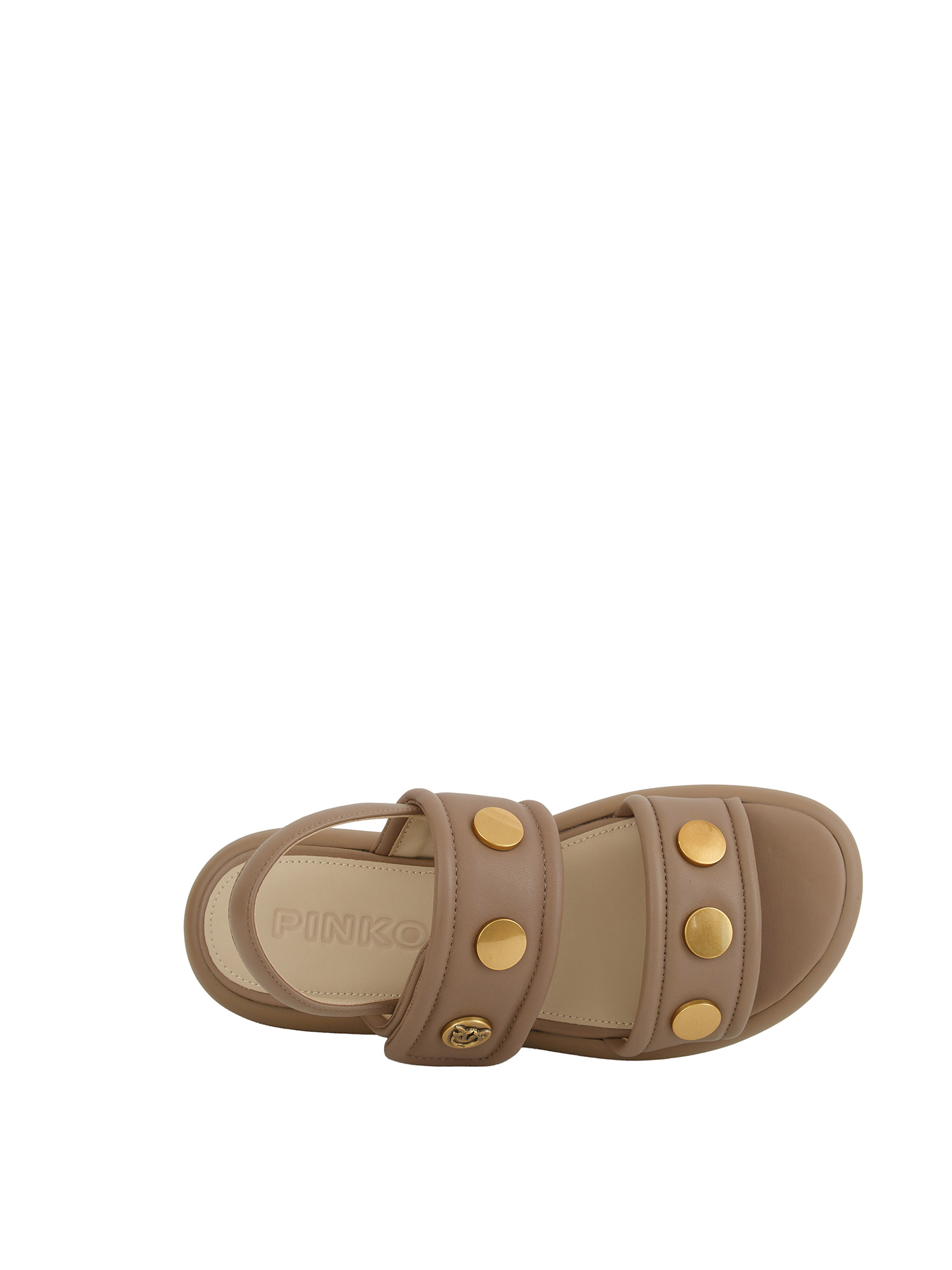 Sandali bassi Fiona Pinko in morbida nappa caratterizzati da due voluminose fasce superiori imbottite e decorate da applicazioni metalliche tonde e piatte, di cui una rifinita dal logo Love Birds per un tocco riconoscibile. Il modello, dotato di una suola ergonomica in gomma dal profilo chunky.