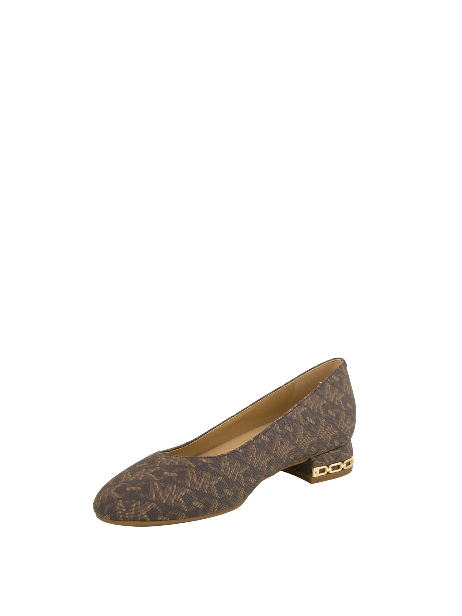 Ballerina June di Michael Michael Kors realizzata in materiale sintetico. Punta arrotondata, interno con fantasia monogram e sottopiede imbottito per una calzata confortevole. Suola in gomma nera, tacco impreziosito da catena decorativa color oro. Altezza 3 cm.