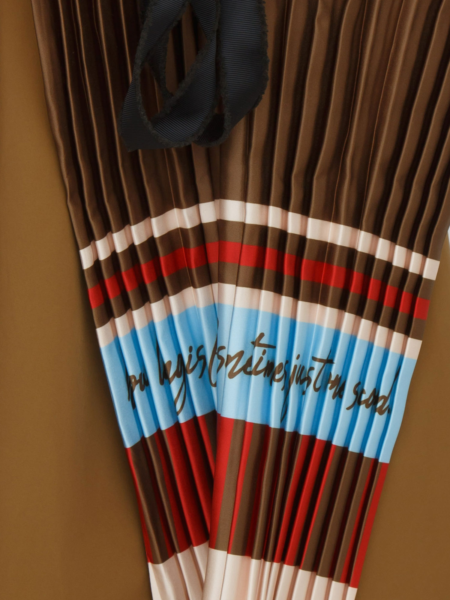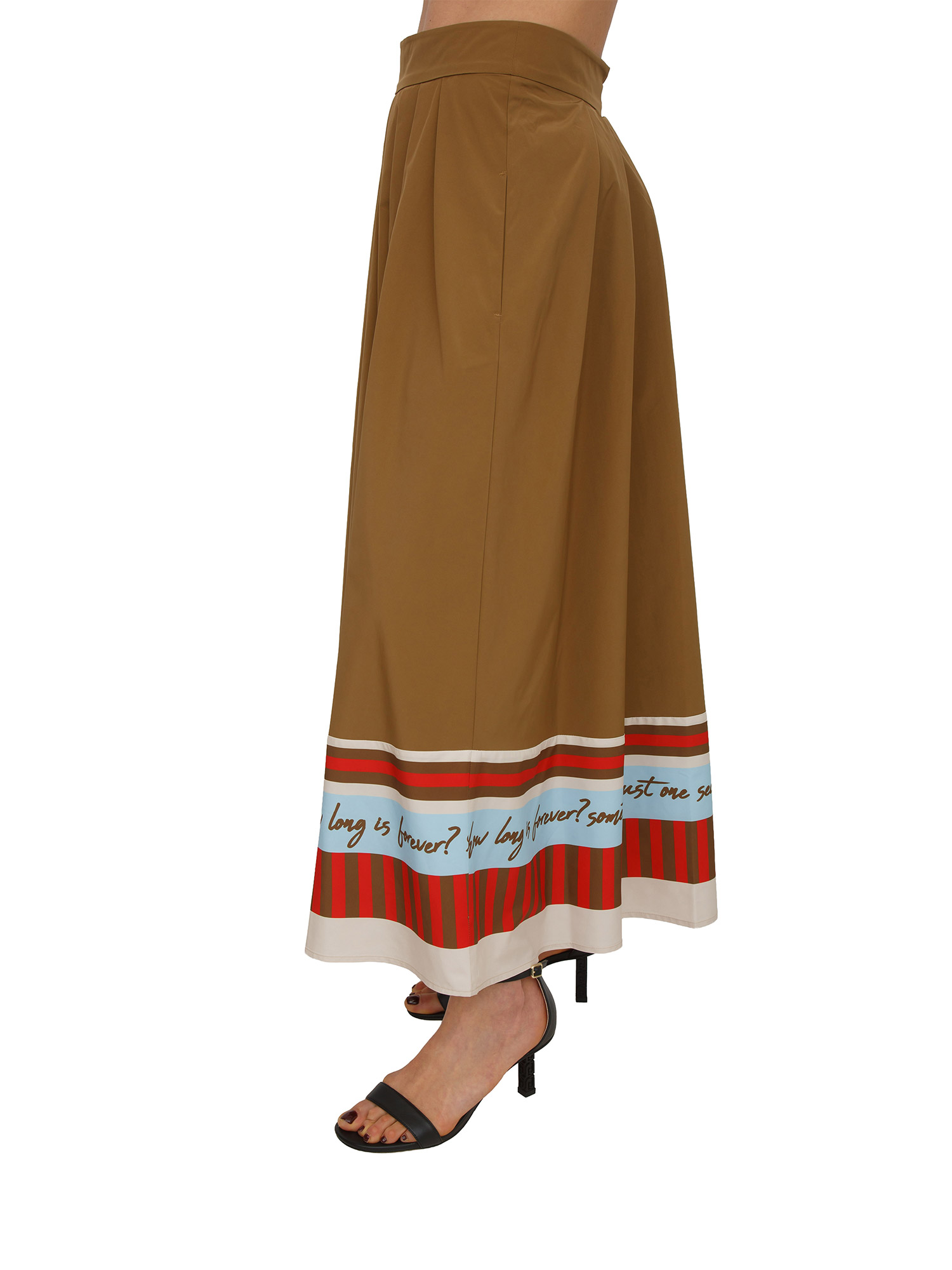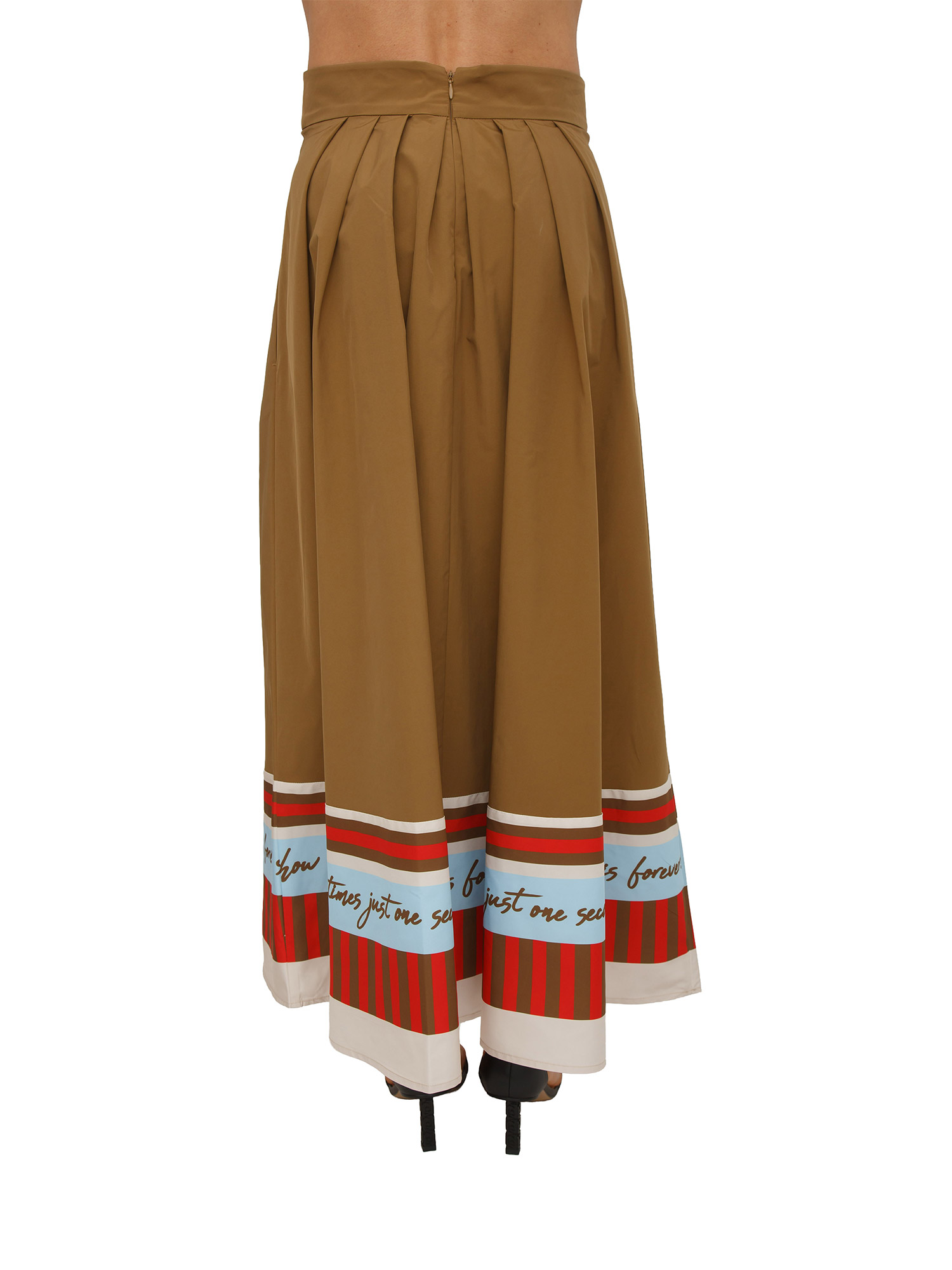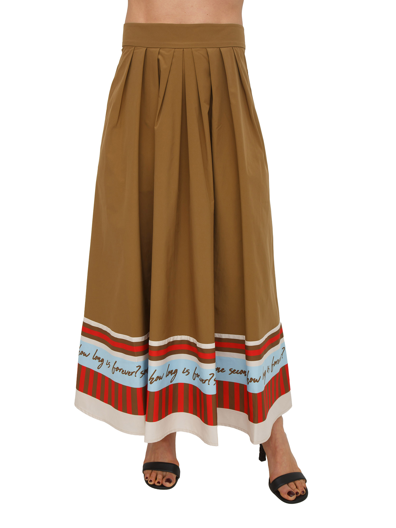 Set gonna e borsa shopping coordinata "Great" Fracomina. Gonna dalla silhouette ampia e bordo decorativo sul fondo con scritte grafiche e motivi a righe. La borsa plissettata richiama i medesimi dettagli per un look davvero fashion. La modella è alta 1.72 e indossa la taglia 42.
