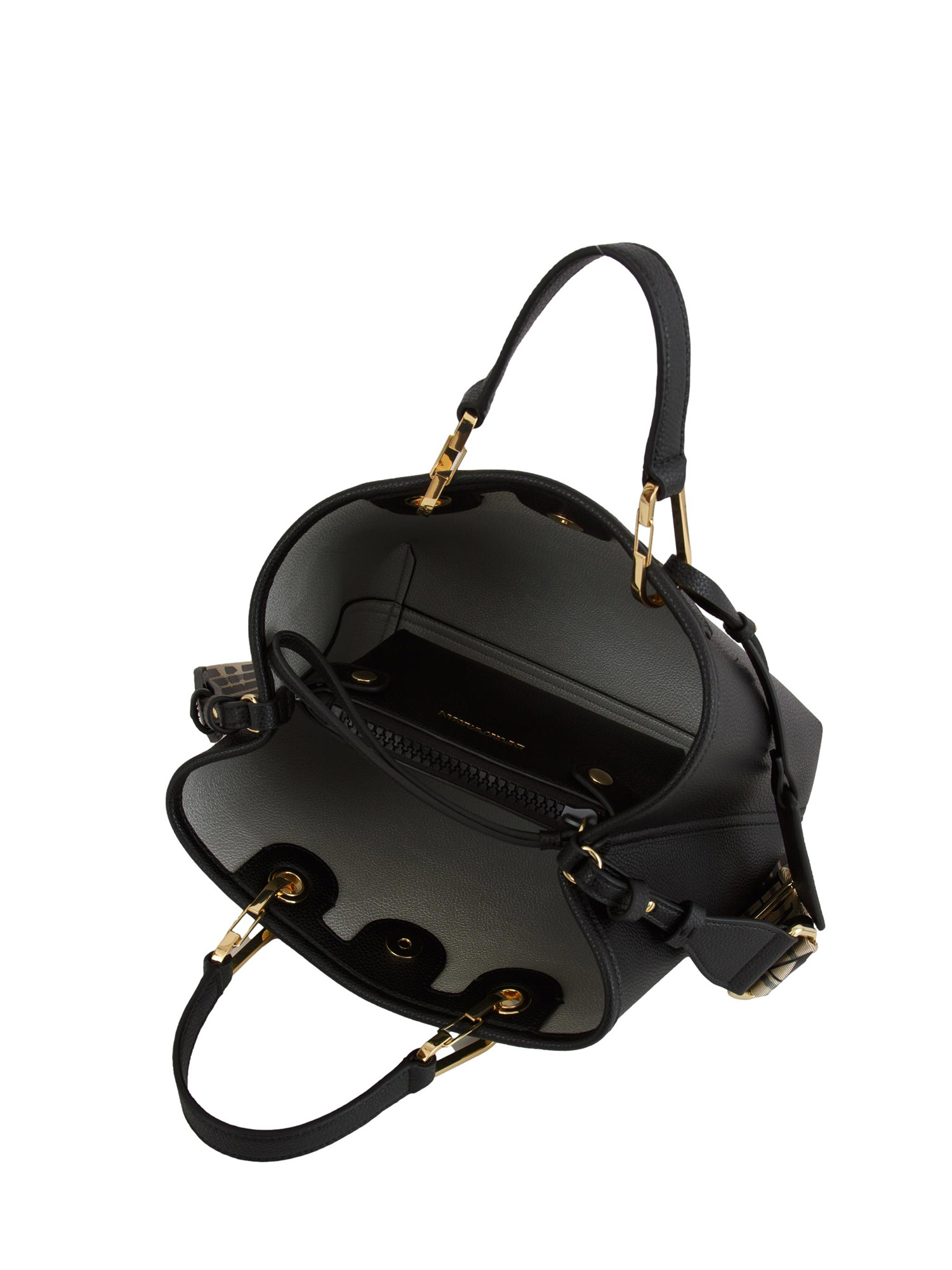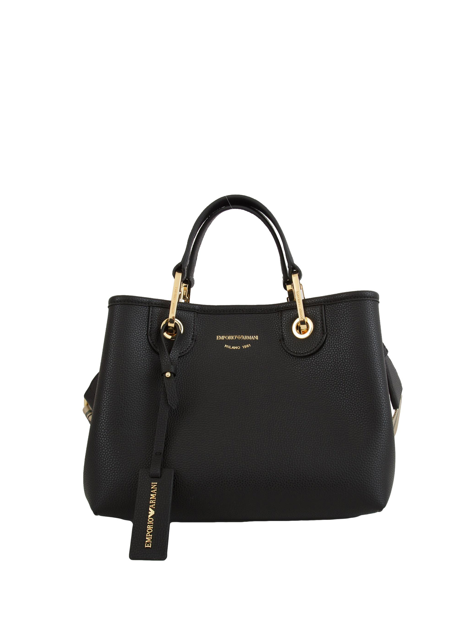 Shopper piccola Emporio Armani realizzata in nappa dalla mano morbida, chiusura a magnete e logo serigrafato. Modello impreziosito da moschettoni logati e tracolla removibile. Provvista di pouch interna coordinata con zip. Dimensioni: 26 x 20 x 10 cm.