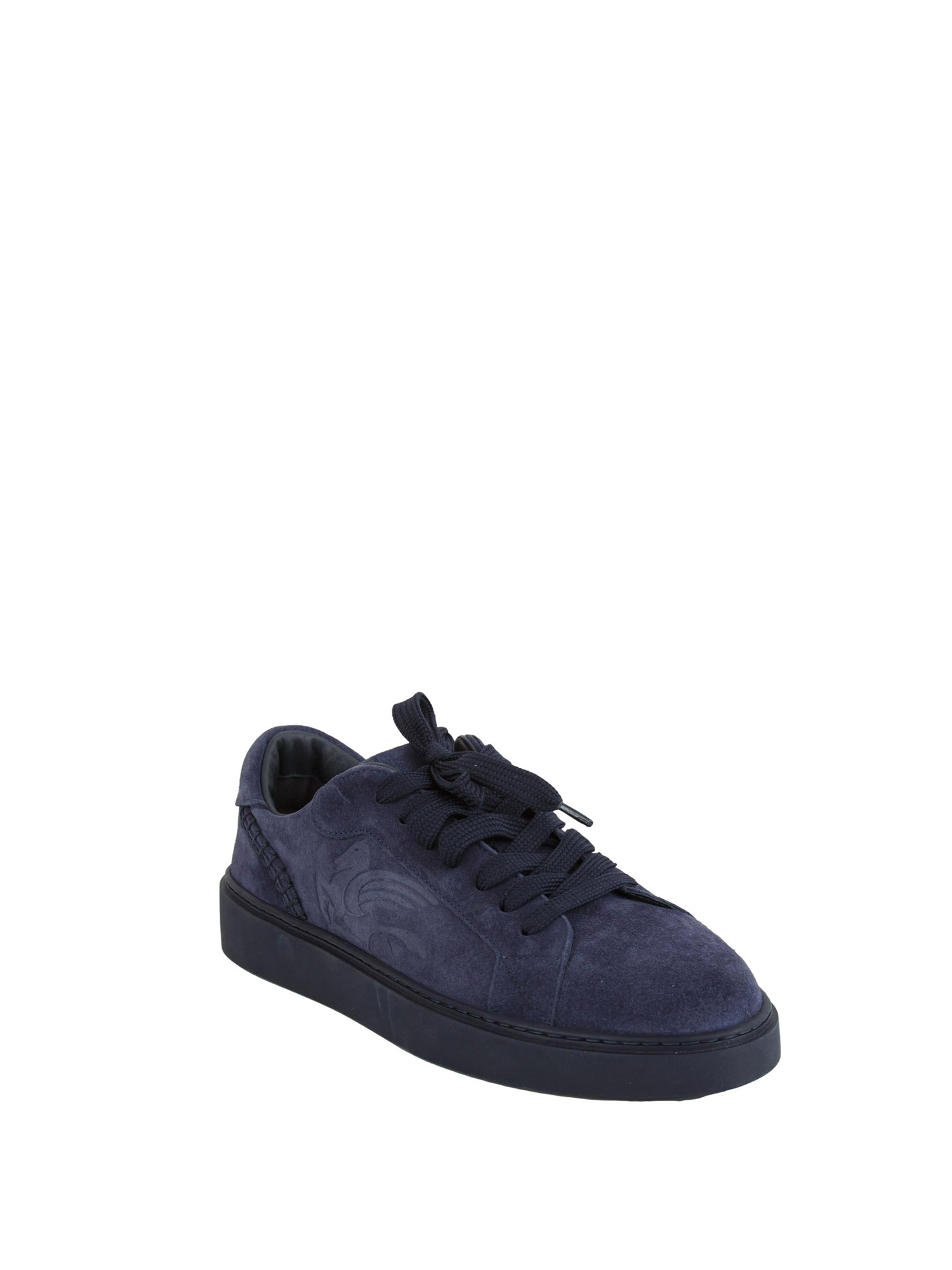 Sneakers Etro uomo stringate realizzate in pelle scamosciata e caratterizzate dal logo Pegaso impresso sul lato e dal logo ETRO sulla linguetta. Completano il modello il fondo a cassetta e la classica suola piatta in gomma.