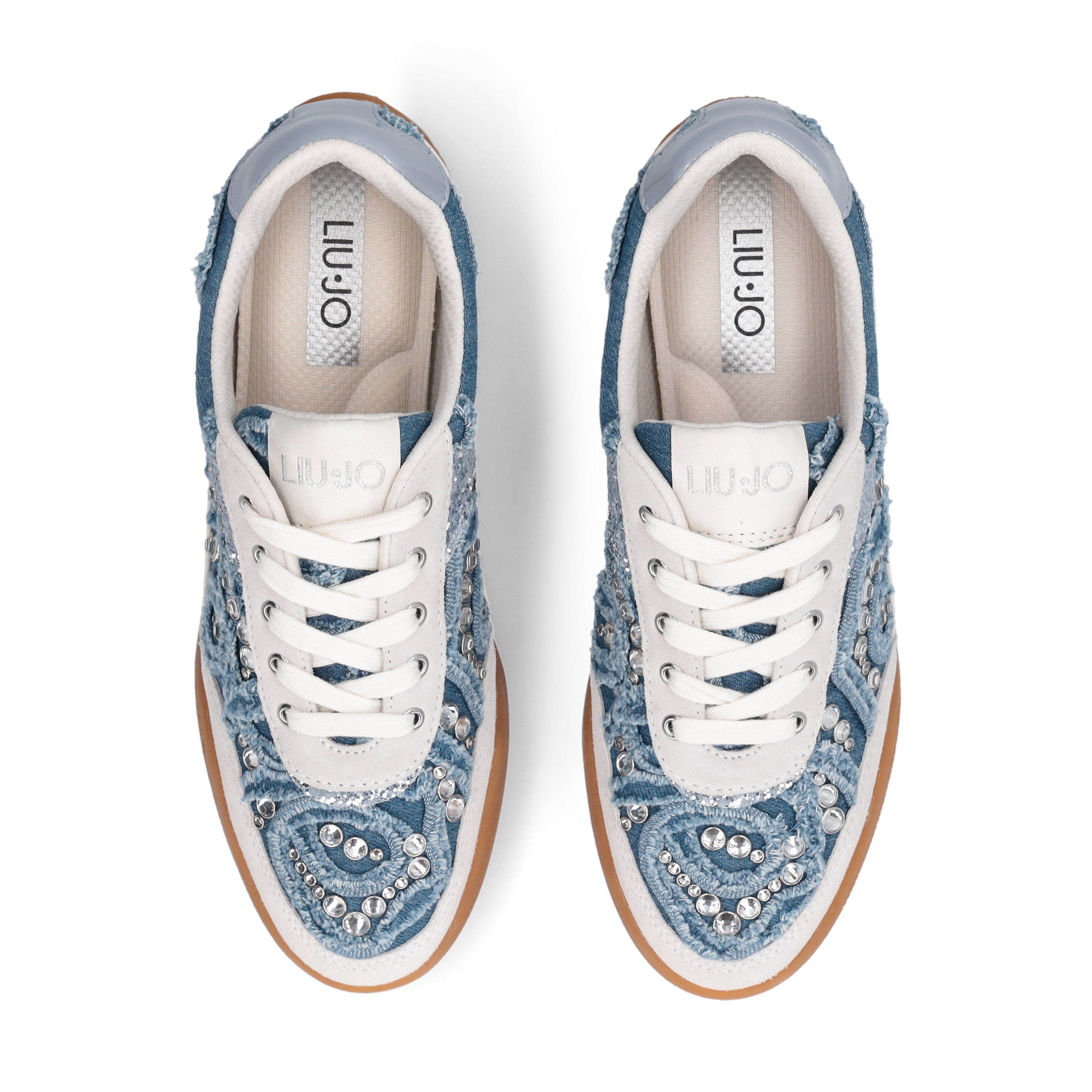 Sneakers Liu Jo donna realizzate con tomaia in denim, dettagli sfrangiati, applicazioni gioiello ed inserti in glitter. Etichetta jacquard, stampa LJ in rilievo e fussbett morbido ed ergonomico con suola bicolor in gomma. Altezza suola: 1,5 cm.