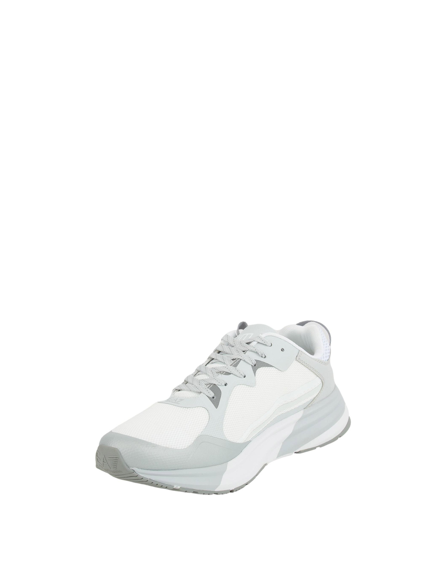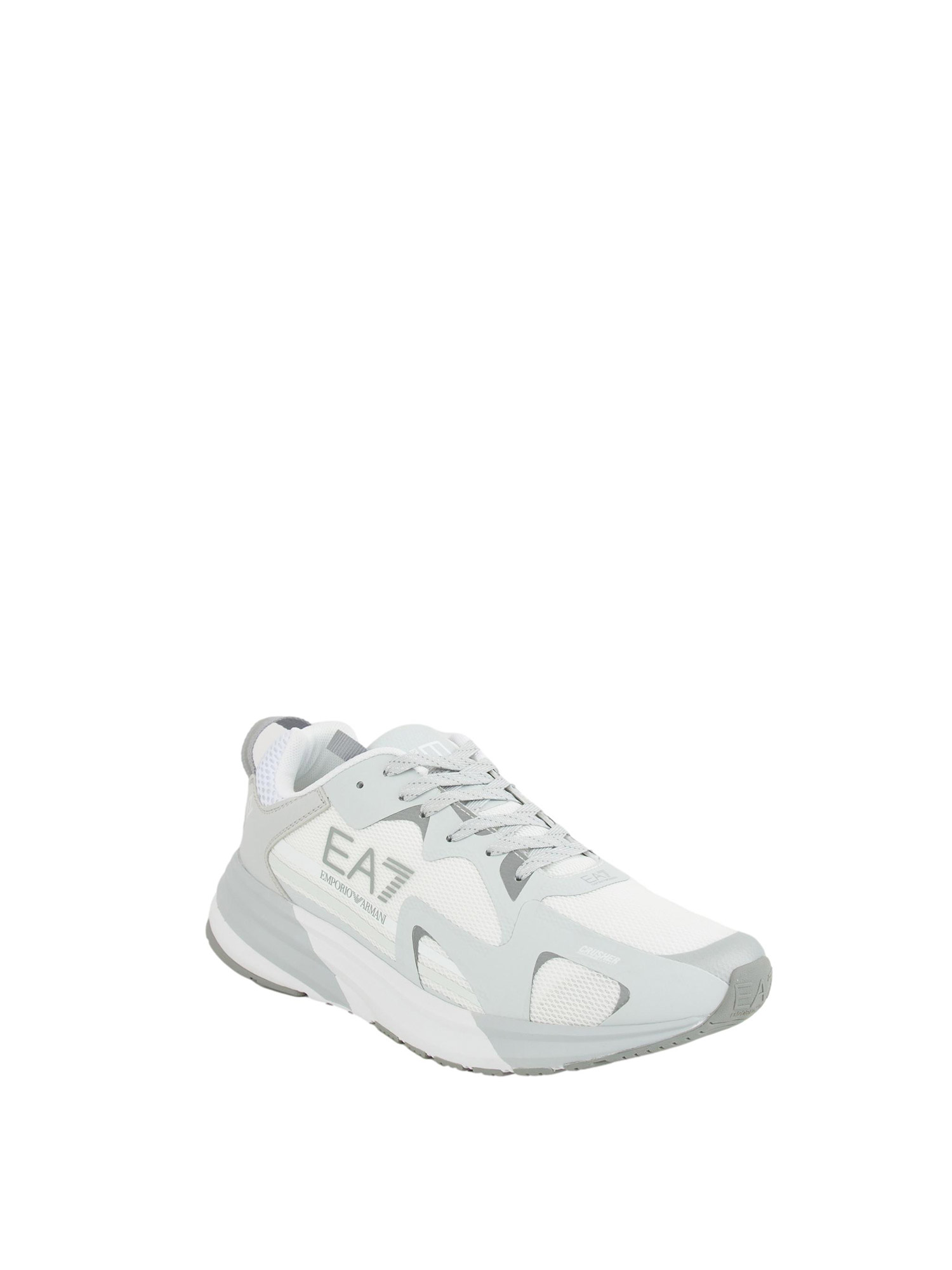 Sneakers da uomo EA7 100% Poliestere, allacciatura con stringhe, collar in mesh imbottito per un comfort ottimale, logo EA7 Emporio Armani sull'intersuola e tomaia, suola alta in gomma con inserti effetto glitter e dettagli riflettenti.