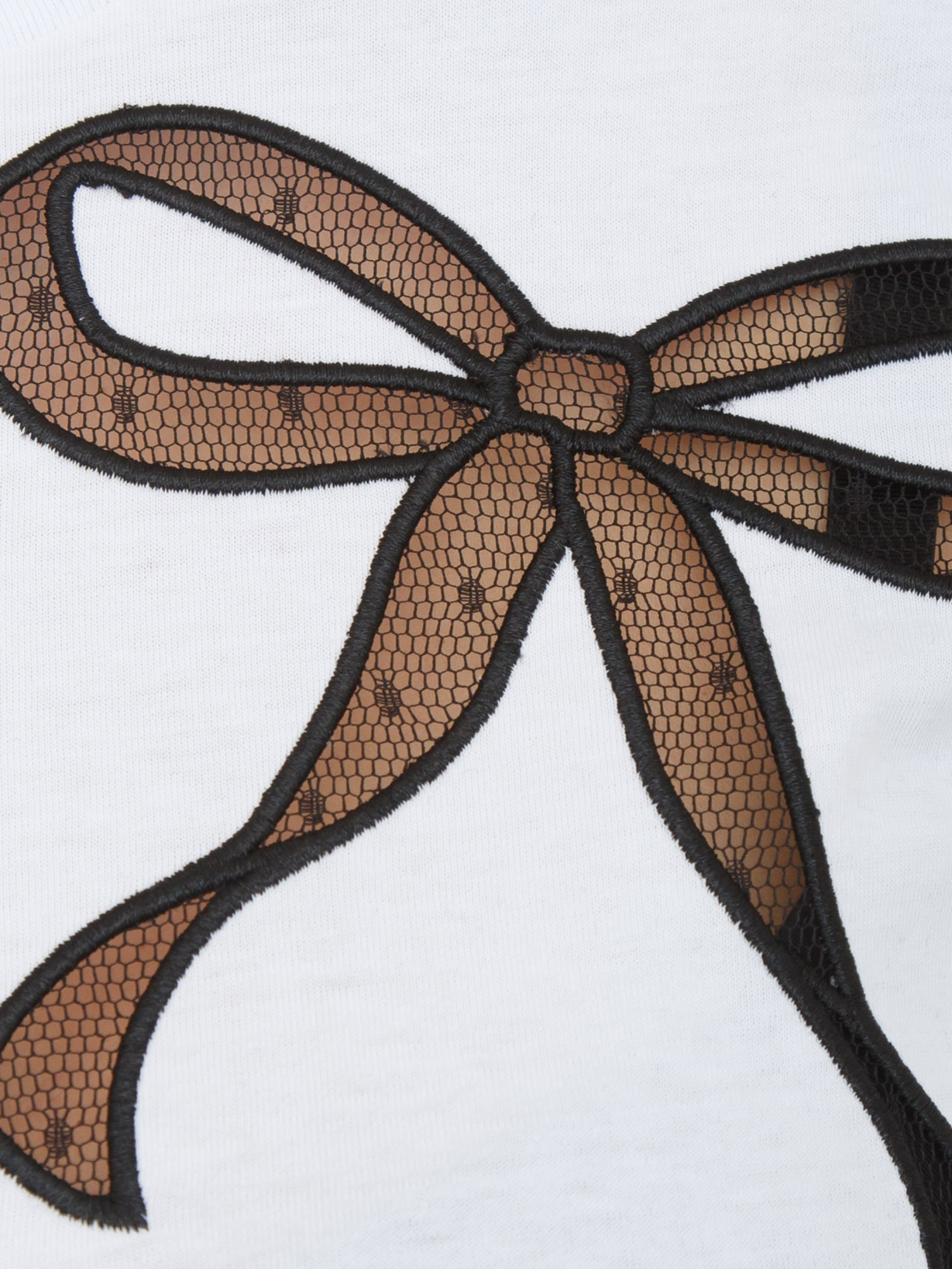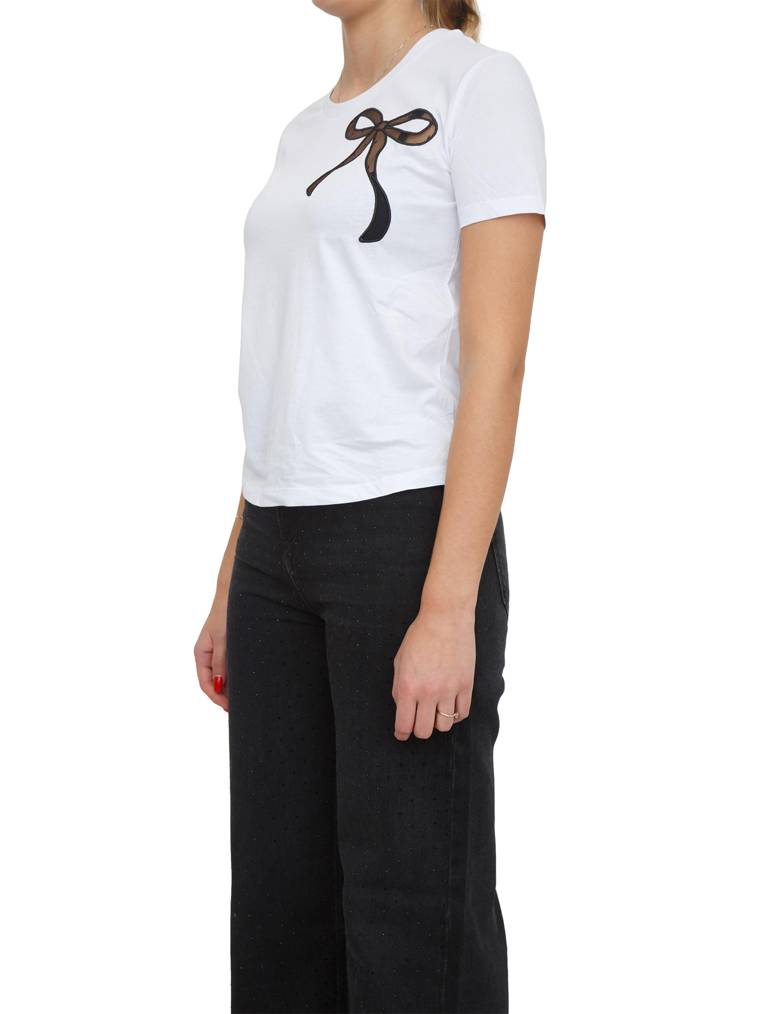 T-shirt Twinet in jersey di cotone con inserto in organza applicato con ricamo fiocco. Ha collo tondo, maniche corte, linea regular. Stupenda come sotto giacca o con un jeans per un look casual ma romantico. La modella è alta 1.77 e indossa la taglia S.
