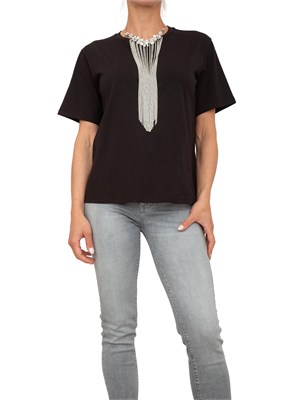 Key-piece trasversale del guardaroba. T-shirt Blugirl in cotone stretch con collana rimovibile di cristalli con frange in catena, collo tondo, maniche corte con spalle scese, linea regular. Da interpretare come vuoi a seconda dell'occasione. La modella è alta 1.72 e indossa la taglia XS.