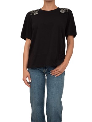 Il lato glamour dell'easywear: t-shirt Blugirl in jersey di cotone con patch ricamati sulle spalle con perline e cristalli su tulle, collo tondo, maniche corte con spalle scese, linea regular. perfetta per elevare tutti gli outfit casual, ma anche come base dei tuoi party look. La modella è alta 1.72 e indossa la taglia S.