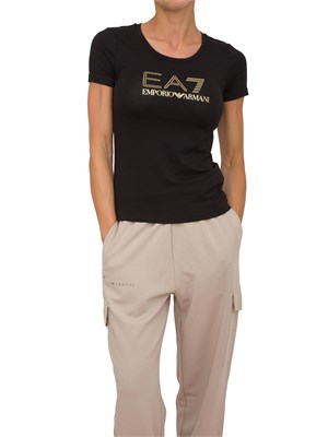 T-shirt donna EA7 Emporio Armani modello girocollo realizzata in morbido tessuto misto cotone e modal stretch, dall'attitudine contemporanea. Il modello, dalla vestibilità regular, è personalizzato dal maxi logo a contrasto con micro borchie dorate che aggiungono un tocco di luce al capo. La modella è alta 1.72 e indossa la taglia S.