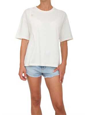 T-shirt manica corta Liu Jo donna modello a girocollo realizzata in jersey di cotone stretch. Modello arricchito da charms con strass applicati lateralmente sul davanti e da patch con logo lettering ricamato dietro. Essenziale ma di carattere. La modella è alta 1.72 e indossa la taglia S.