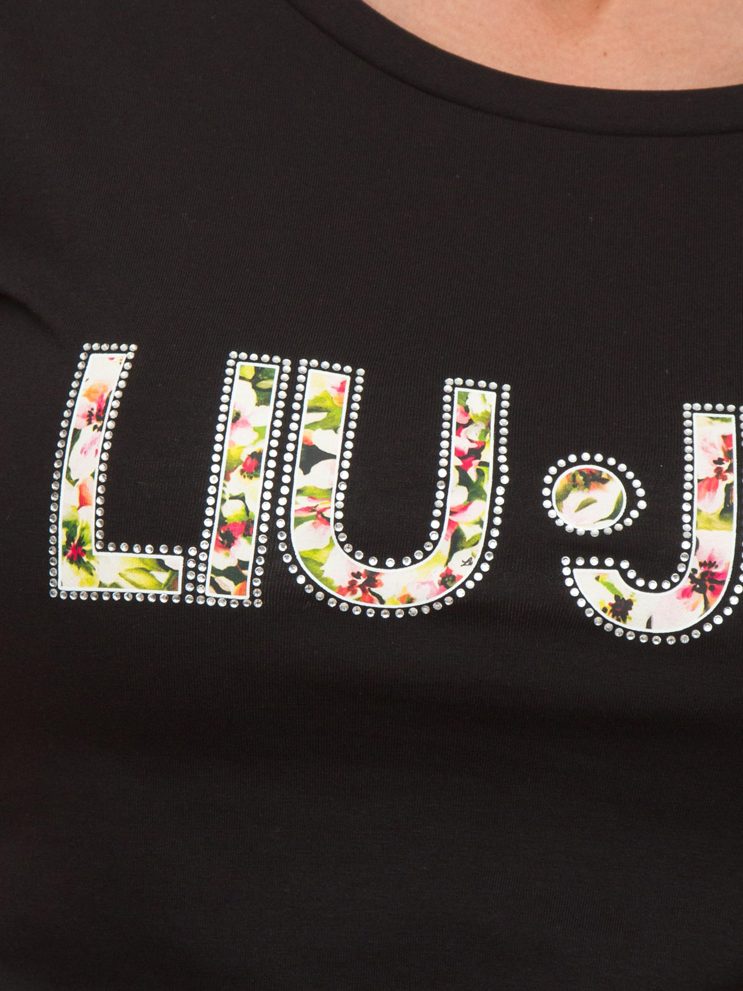 T-shirt nera Liu Jo donna con logo motivo floreale e contorno strass