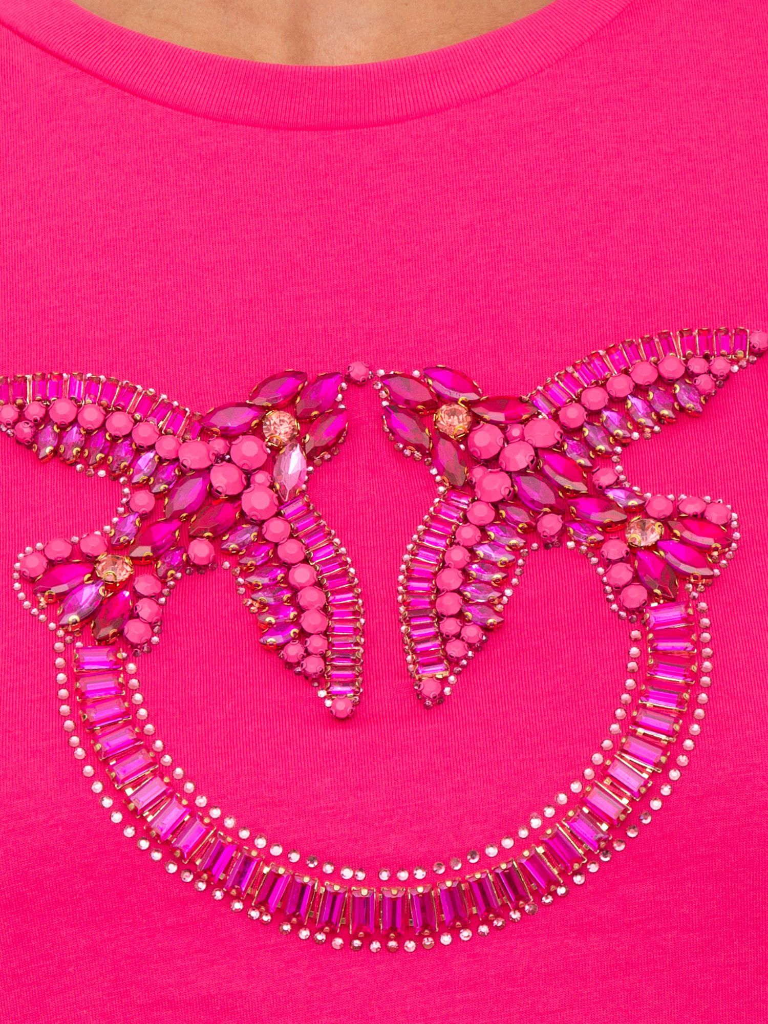 T-shirt Pinko a maniche corte in jersey di cotone con maxi ricamo gioiello Love Birds davanti.