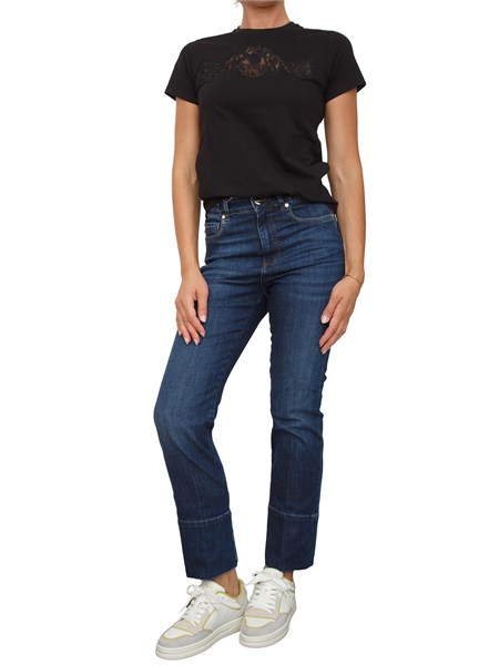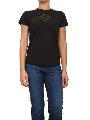 T-shirt Twinset realizzata in jersey di cotone con pizzo intarsiato e logato in trasparenza sul davanti. Il design con maniche corte e la linea dritta la rendono perfetta sotto una giacca o un giubbino di pelle per un look moderno e romantico. La modella è alta 1.72 e indossa la taglia XS.