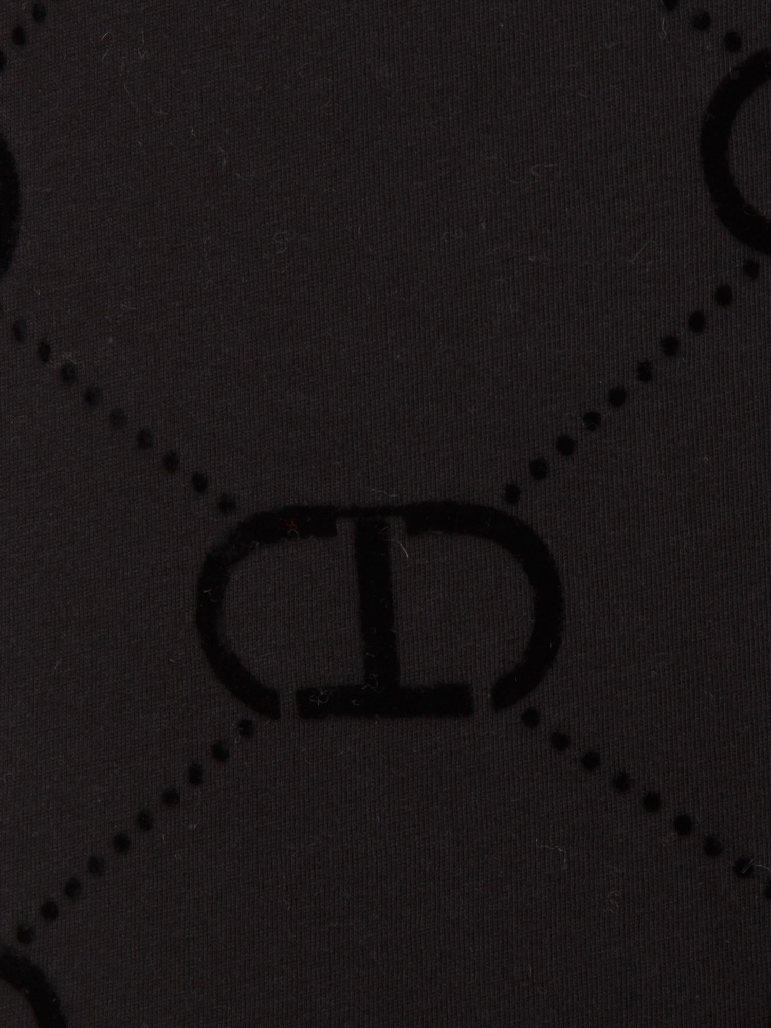 T-shirt Twinset realizzata in jersey di cotone con stampa floccata Oval T all over davanti e sulle maniche. Design con collo tondo, maniche corte con spalle leggermente scese e linea dritta. La modella è alta 1.77 e indossa la taglia XS.