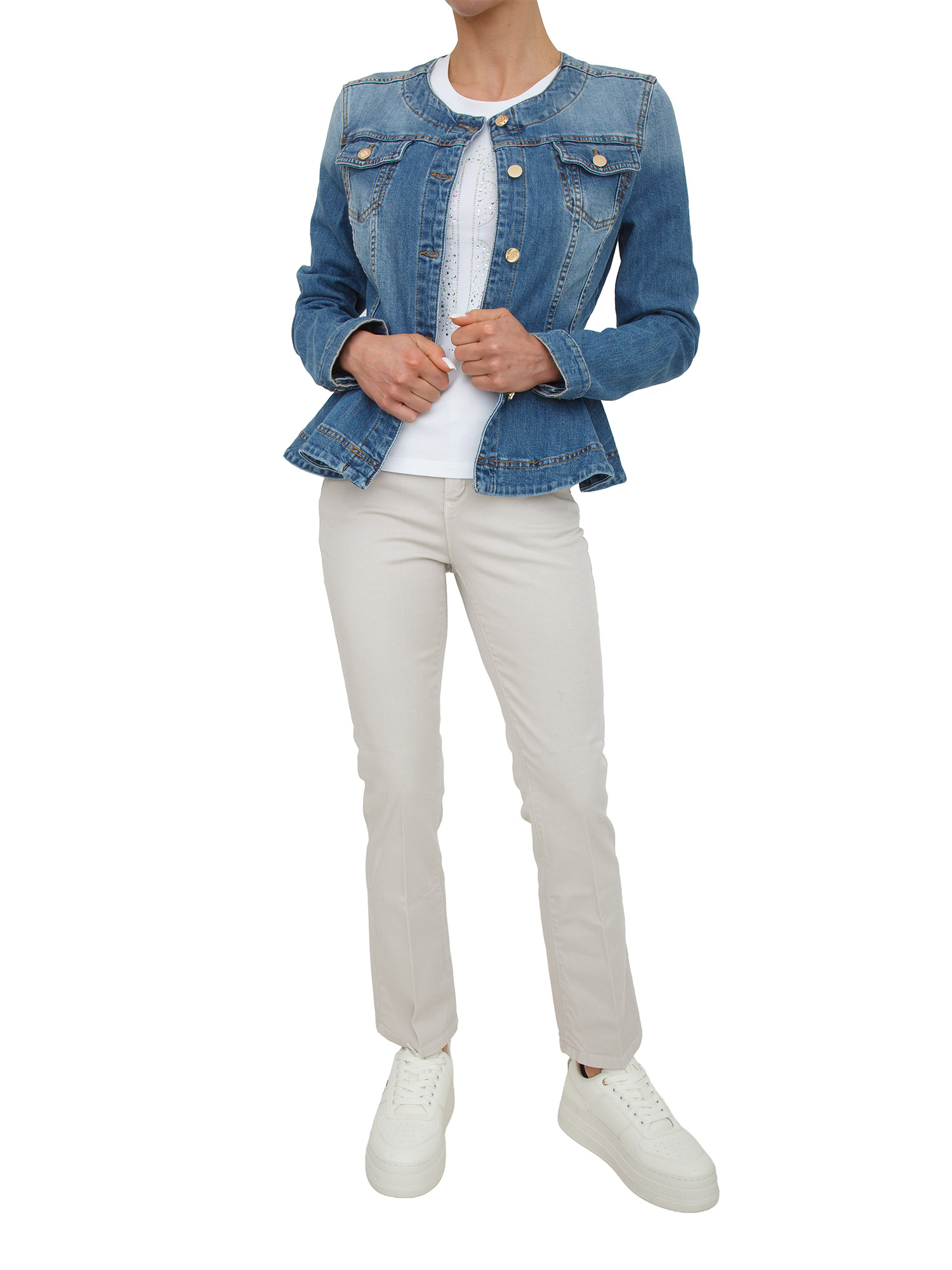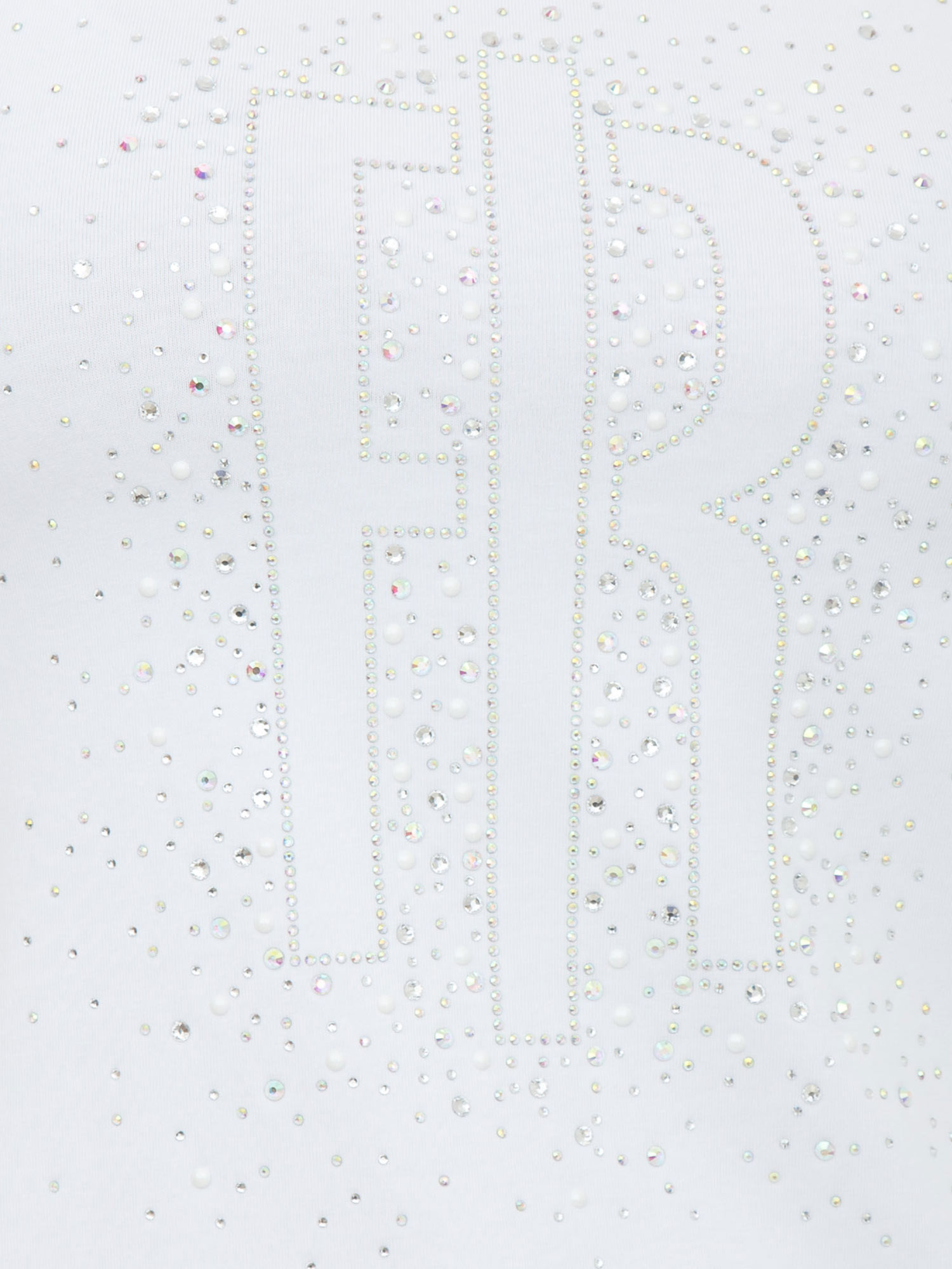 T-shirt Fracomina realizzata in morbido jersey di cotone elasticizzato con design a girocollo e maniche corte. Stupendi strass luminosi formano il logo davanti e donano luminosità al tuo look casual. La modella è alta 1.72 e indossa la taglia S.