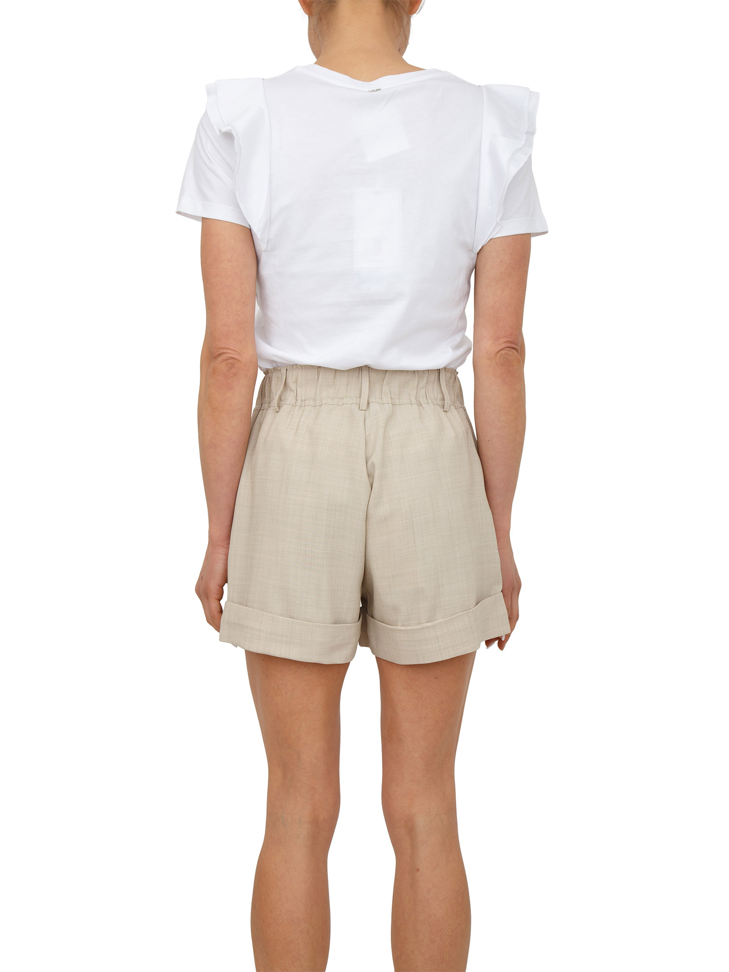 T-shirt Fracomina realizzata in morbido jersey di cotone con girocollo e maniche corte a rouches con applicazioni luminose. Meravigliosamente chic da indossare su look eleganti o casual. La modella è alta 1.72 e indossa la taglia S.