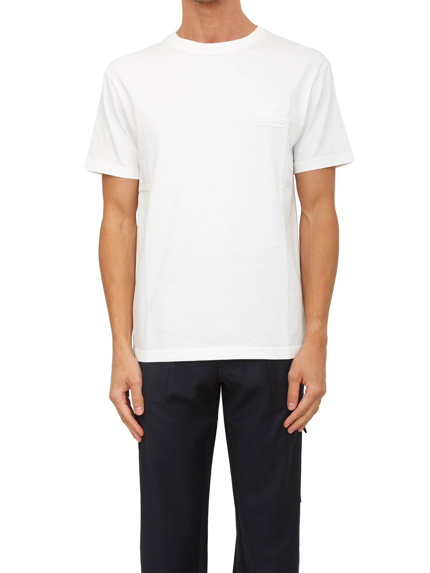 T-shirt girocollo Etro uomo realizzata in puro cotone tinta unita con vestibilità regular e logo monogram ETRO e Pegaso ricamati in tono sul petto. Un must-have del guardaroba maschile. Il modello è alto 1.90m e indossa la taglia M.