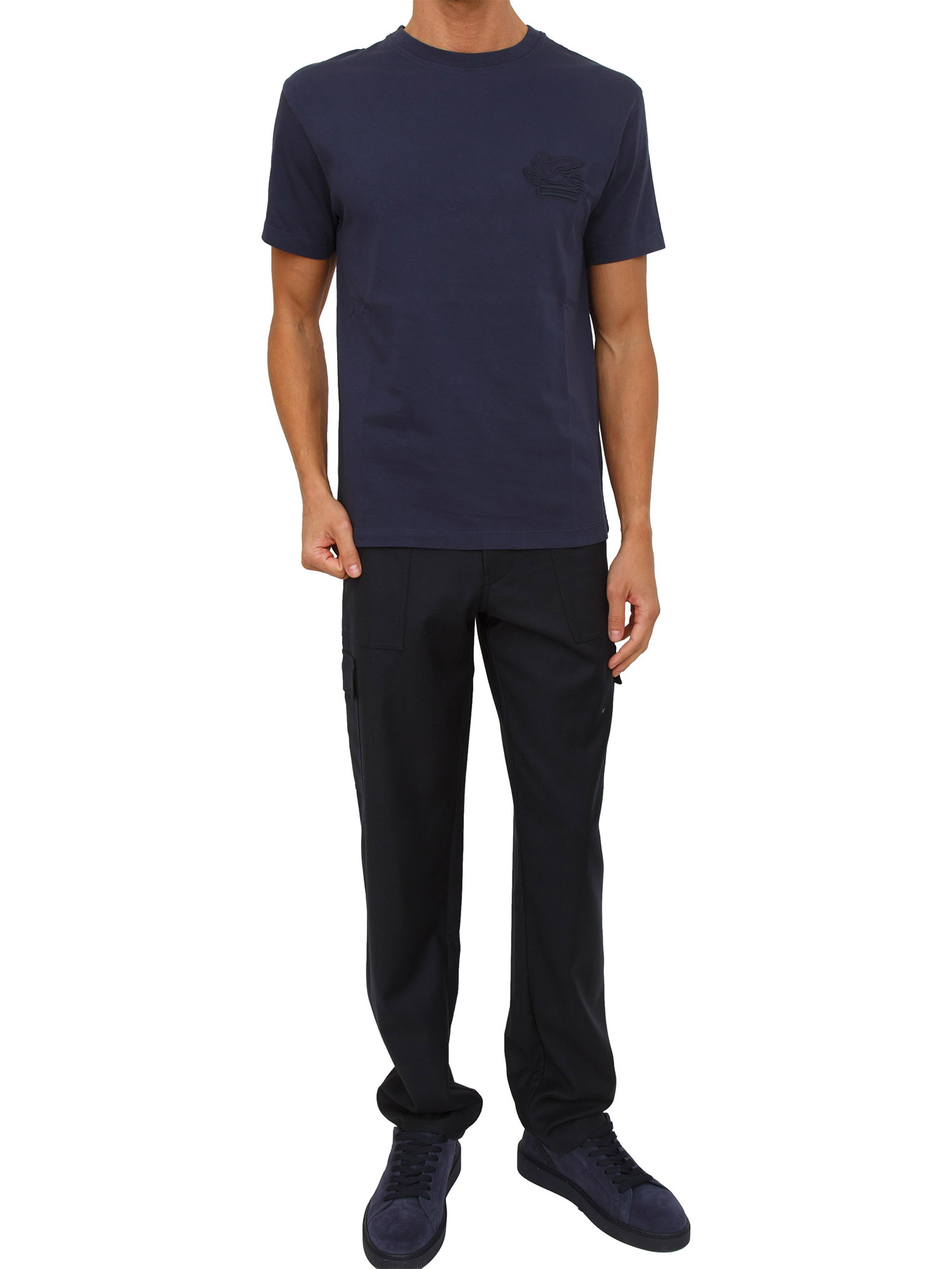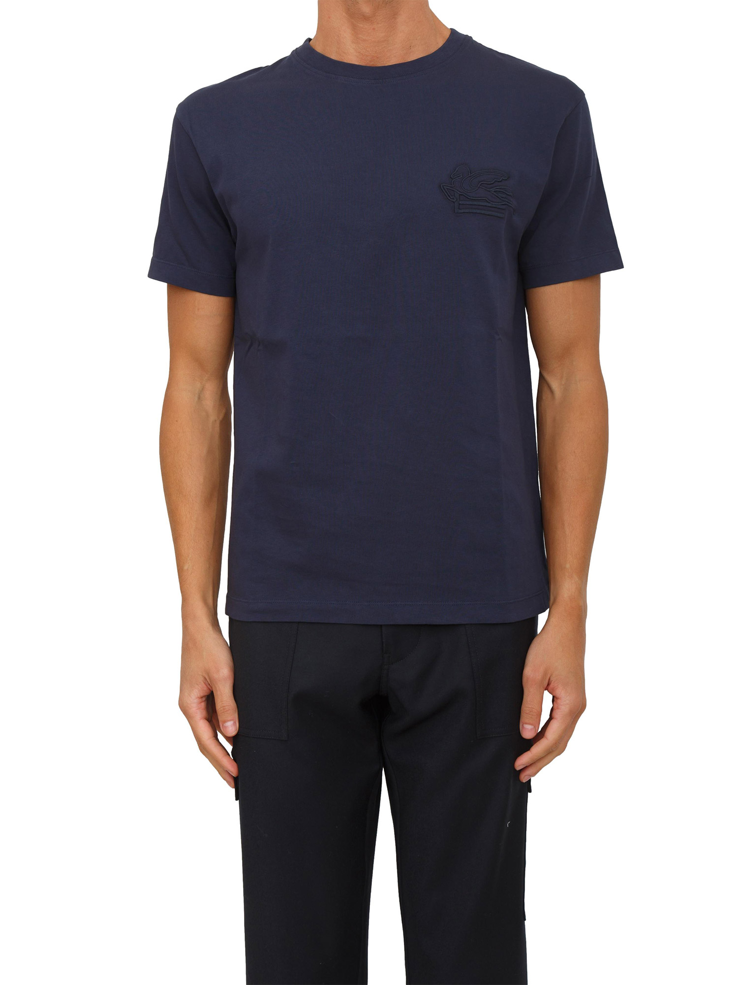 T-shirt girocollo Etro uomo realizzata in puro cotone tinta unita con vestibilità regular e logo monogram ETRO e Pegaso ricamati in tono sul petto. Un must-have del guardaroba maschile. Il modello è alto 1.90m e indossa la taglia M.