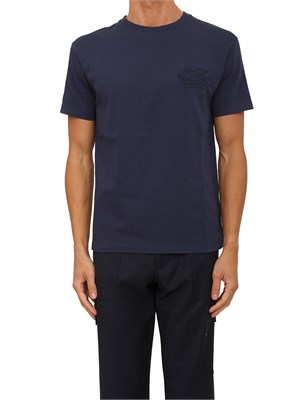 T-shirt girocollo Etro uomo realizzata in puro cotone tinta unita con vestibilità regular e logo monogram ETRO e Pegaso ricamati in tono sul petto. Un must-have del guardaroba maschile. Il modello è alto 1.90m e indossa la taglia M.