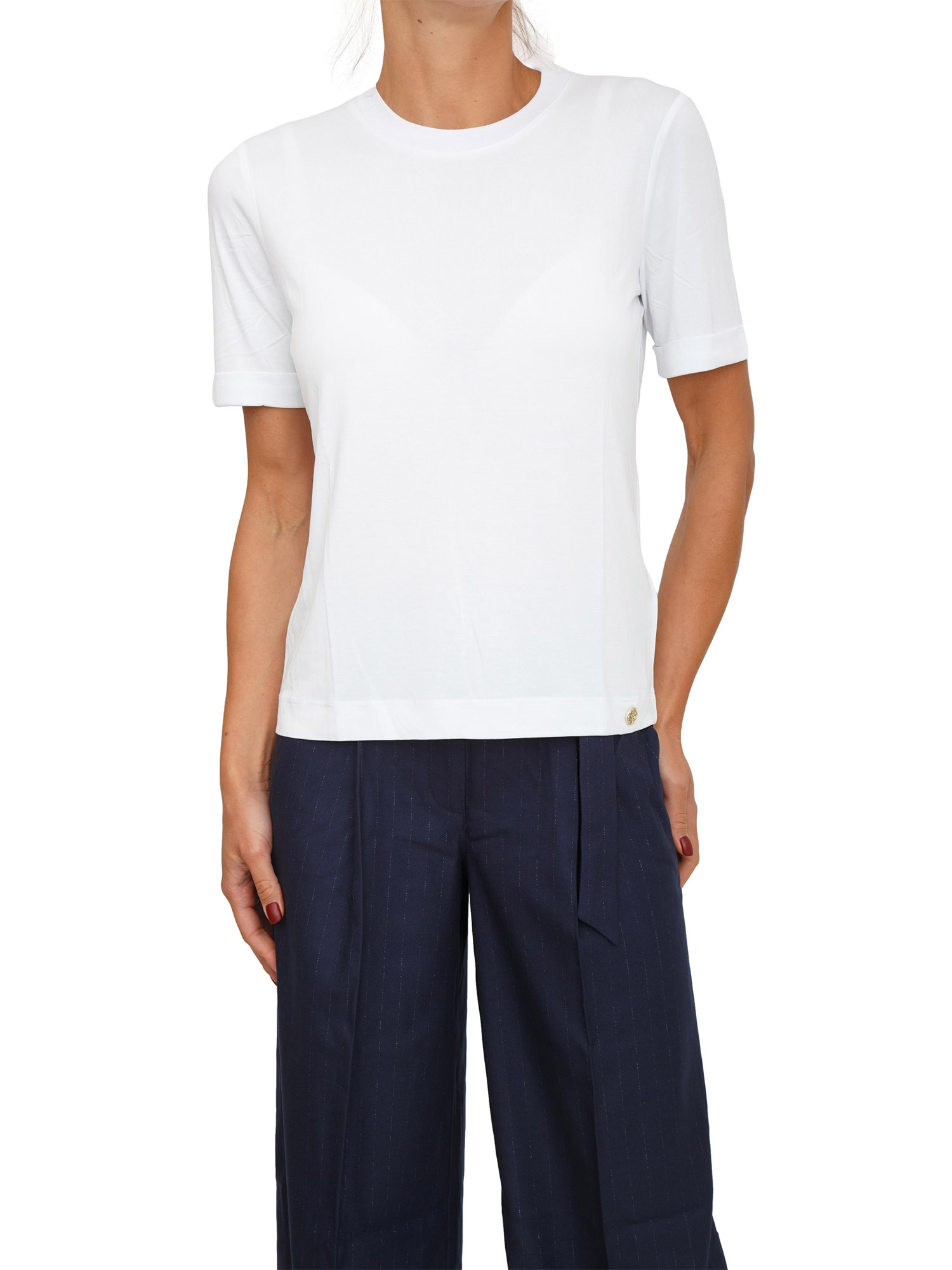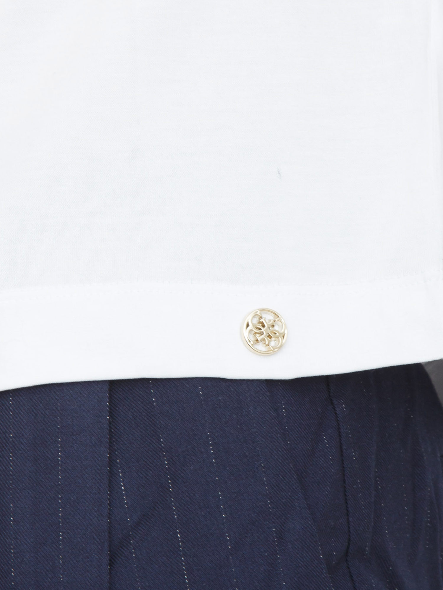 T-shirt Guess Jeans donna ralizzata in morbido cotone con girocollo e maniche corte con risvolto. Vestibilità regular bellissima, con logo applicato sul fondo e dietro il collo. Bellissima su qualsiasi outfit. La modella è alta 1.72 e indossa la taglia XS.