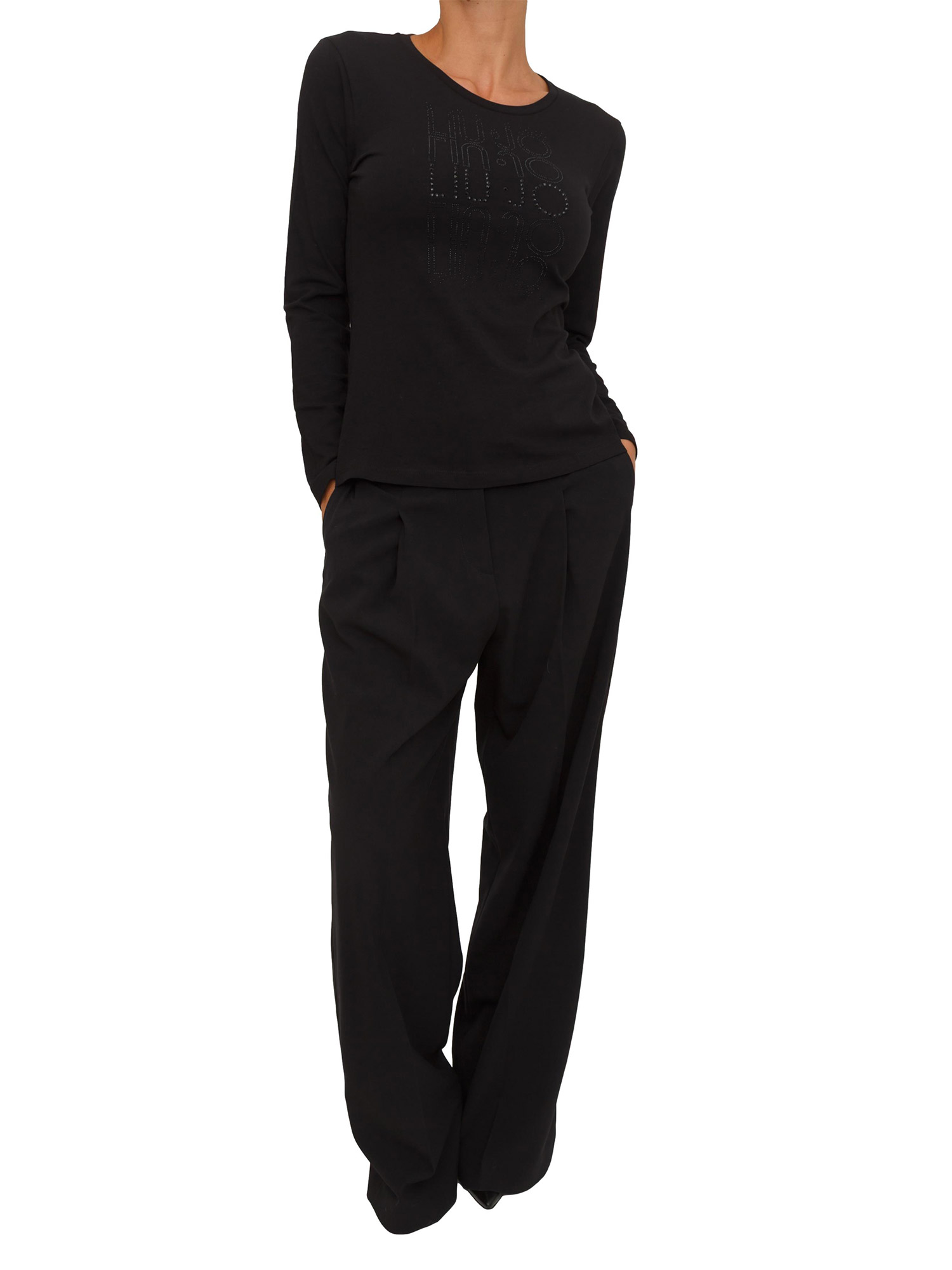 T-shirt Liu Jo donna realizzata in jersey di cotone stretch con logo strass sul davanti. Modello girocollo con maniche lunghe e vestibilità regular. Perfetta sotto ogni blazer. La modella è alta 1.72 e indossa la taglia XS.