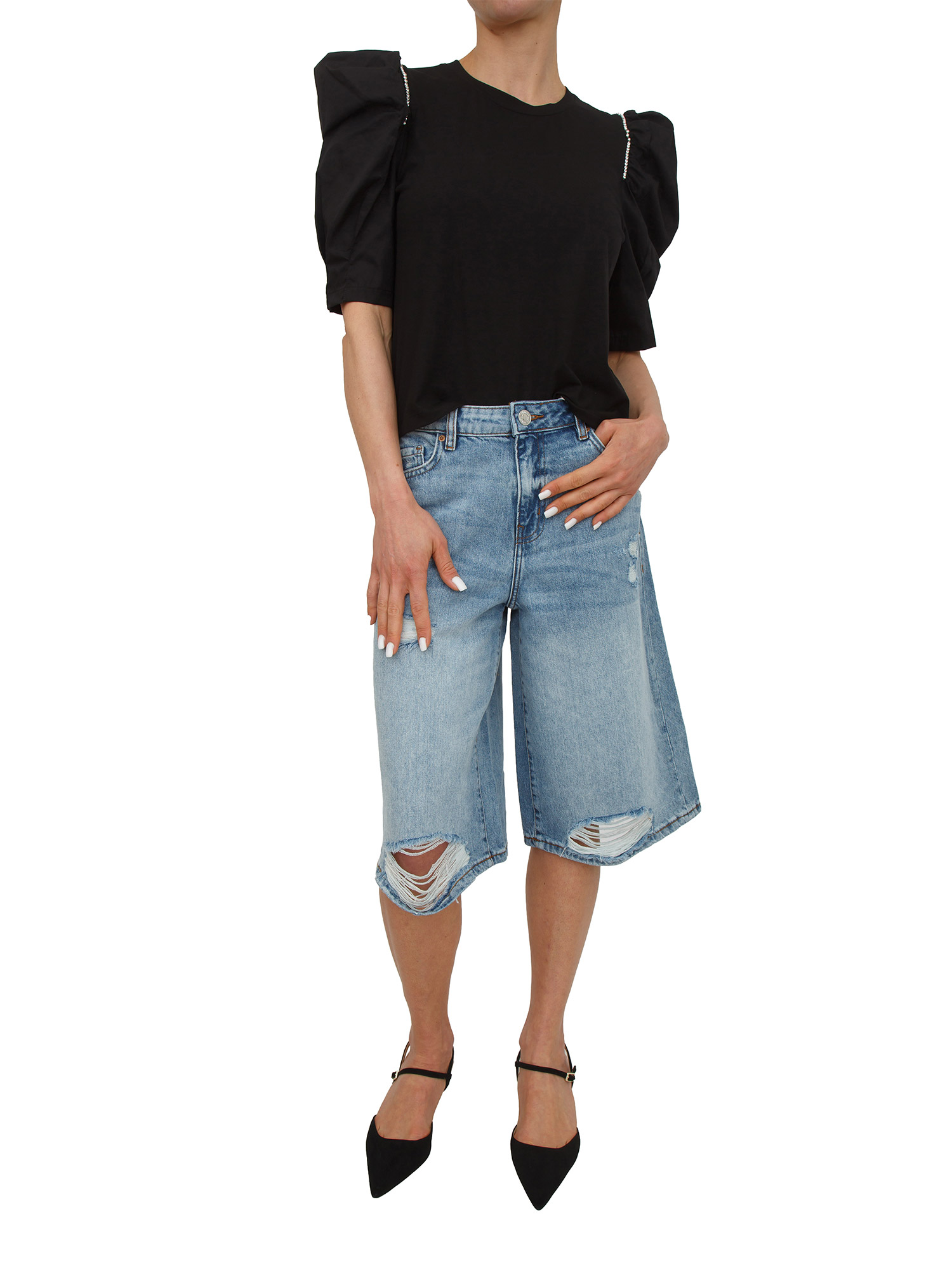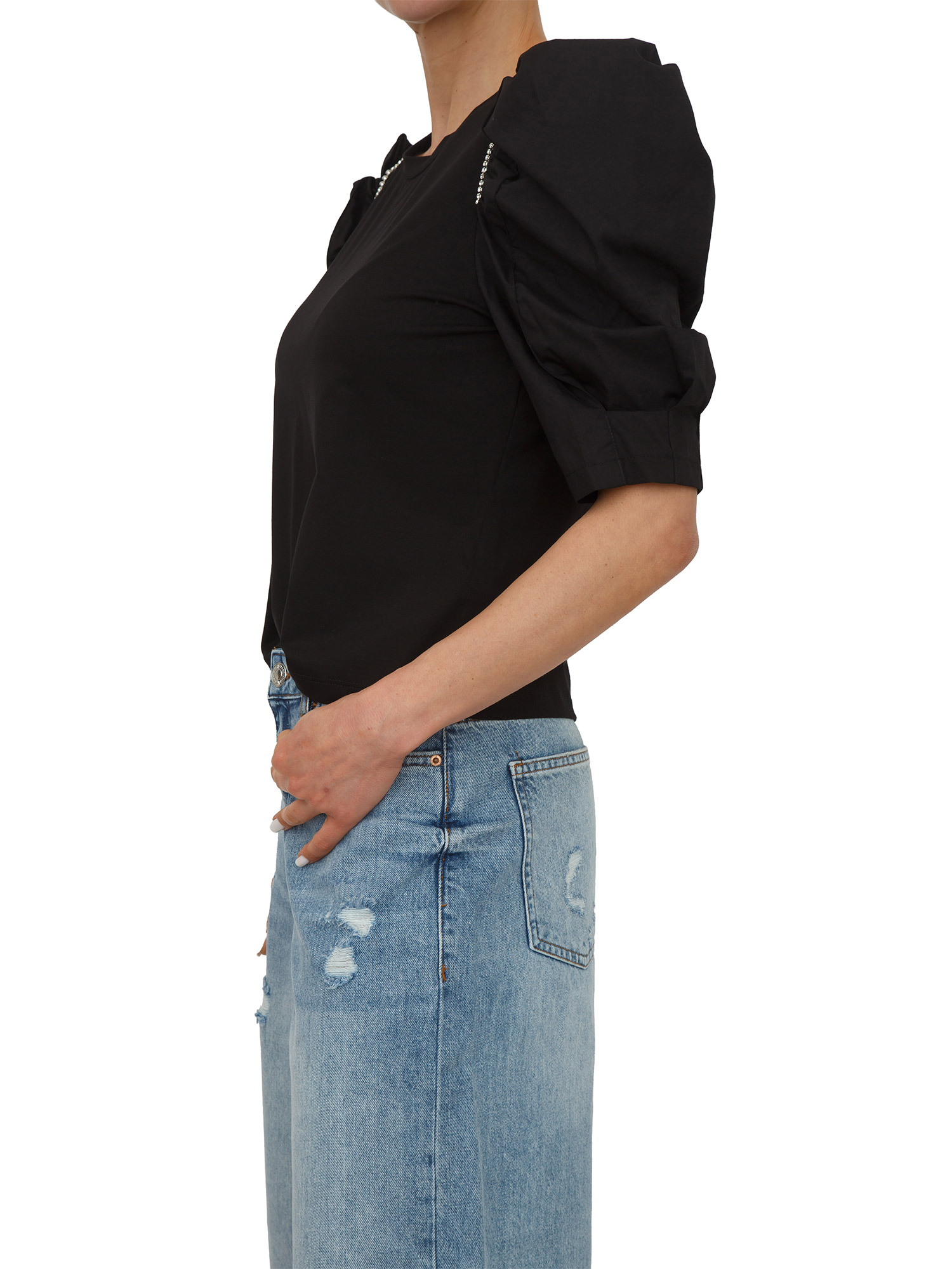 T-shirt nera Fracomina in cotone con strass e maniche a sbuffo