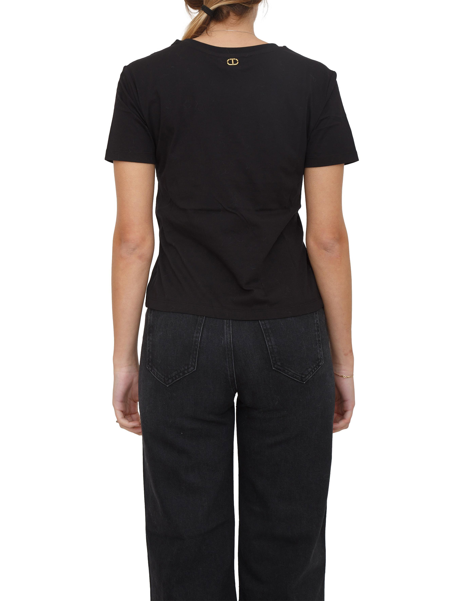 T-shirt Twinet in jersey di cotone con inserto in organza applicato con ricamo fiocco. Ha collo tondo, maniche corte, linea regular. Stupenda come sotto giacca o con un jeans per un look casual ma romantico. La modella è alta 1.77 e indossa la taglia S.