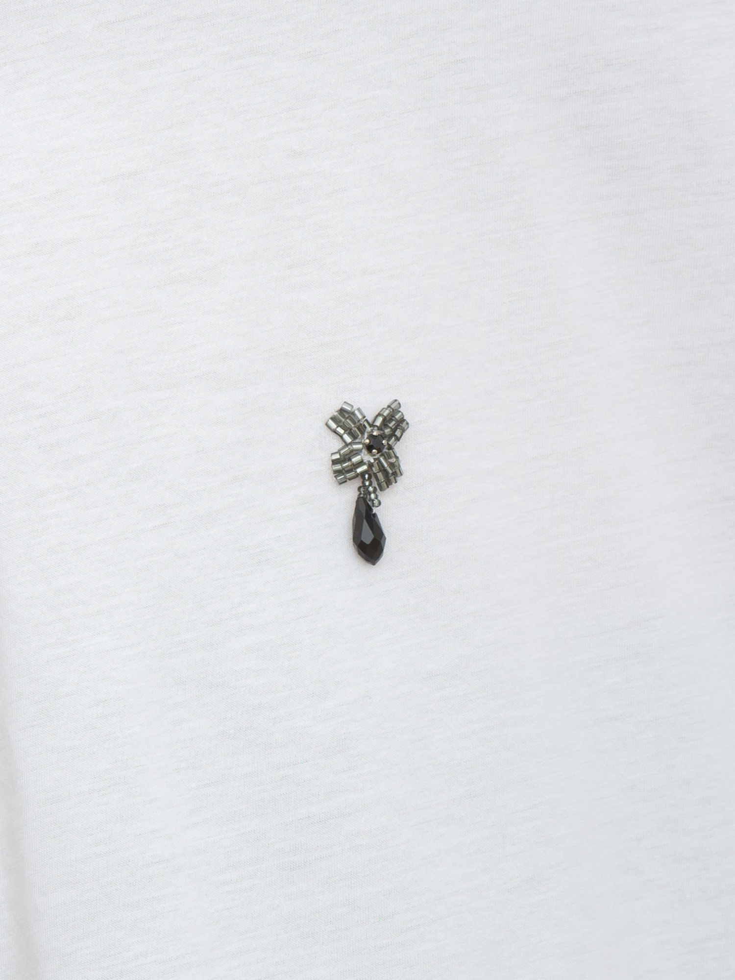 T-shirt Pontile Max Mara realizzata in pregiato 100% cotone a girocollo e maniche corte. Design arricchito da applicazioni cristalli con fiocco e goccia sul davanti e ricamo logo con strass dietro sul collo. La modella è alta 1.72 e indossa la taglia S.