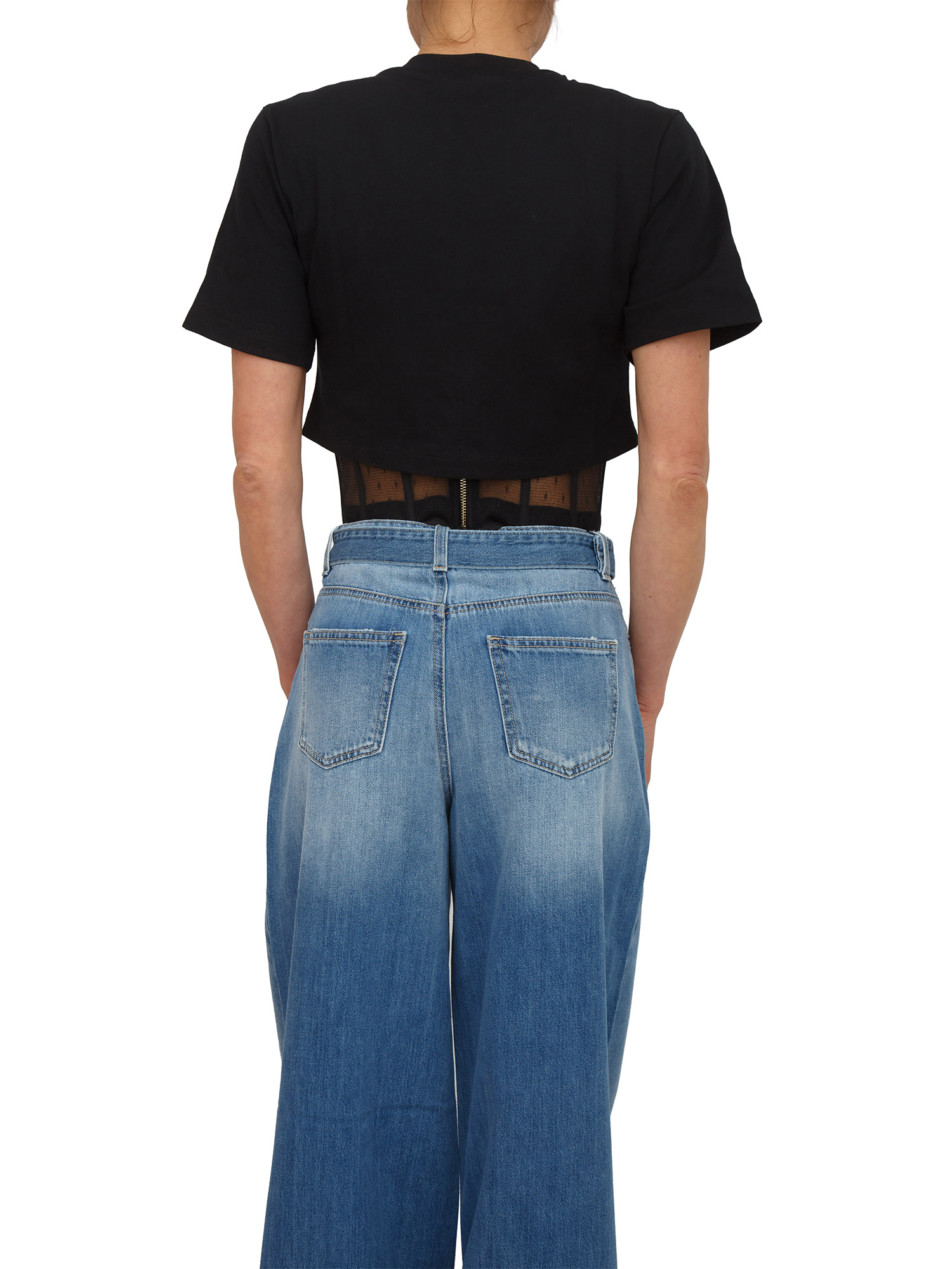 T-shirt Twinset realizzata in puro cotone con girocollo, maniche corte e bustier con chiusura zip attaccato nella parte sotto. Questa t-shirt è di una femminilità unica e diventerà un passepartout per tutta l'estate. La modella è alta 1.72 e indossa la taglia S.