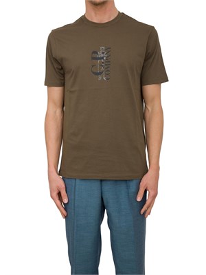 T-shirt uomo verde C.P. Company realizzata in jersey di cotone 30/1 con vestibilità regular e logo stampato sul petto. Il modello è alto 1.90 cm e indossa la taglia L.