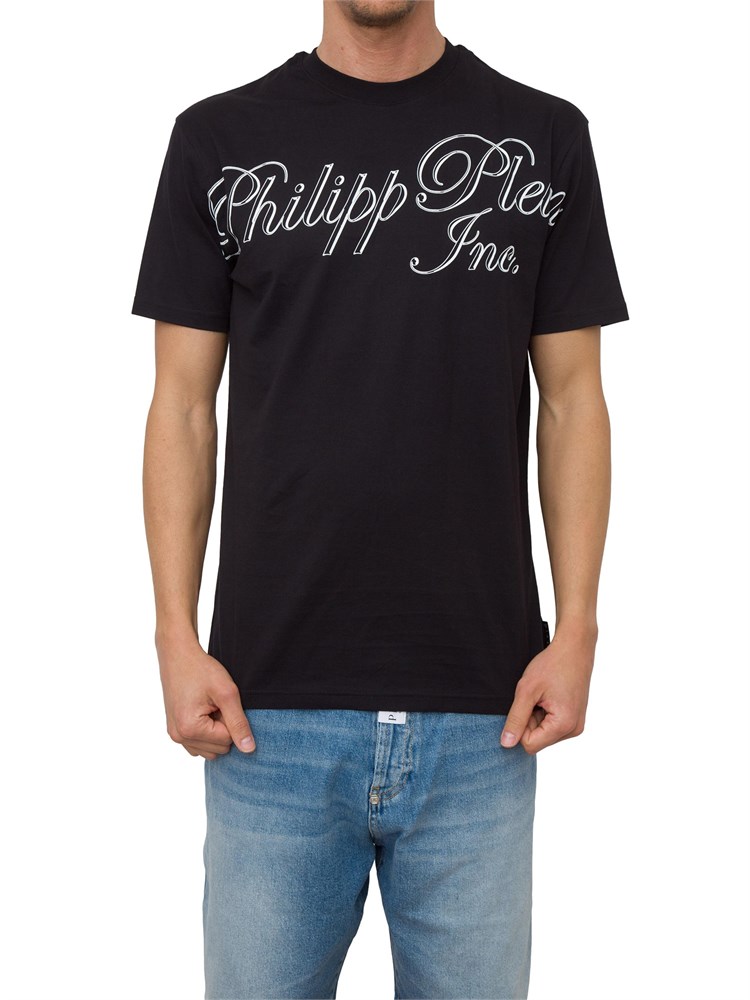 T-shirt realizzata in jersey di cotone, lettering del brand è stampato sul fronte, PP Hexagon su patch di pelle saffiano cucito sul carré, girocollo smacchinato a costina e i bordi sono rifiniti a due aghi.