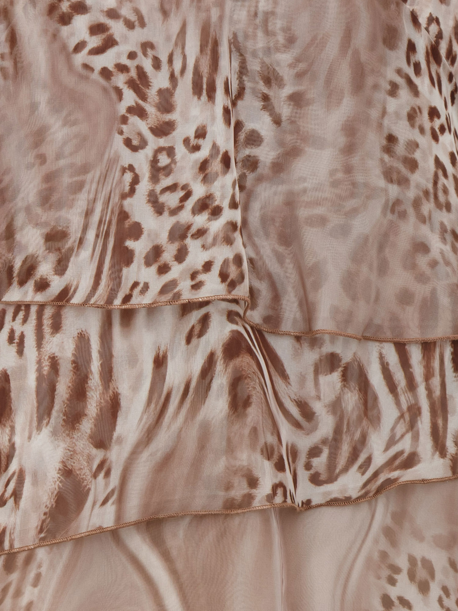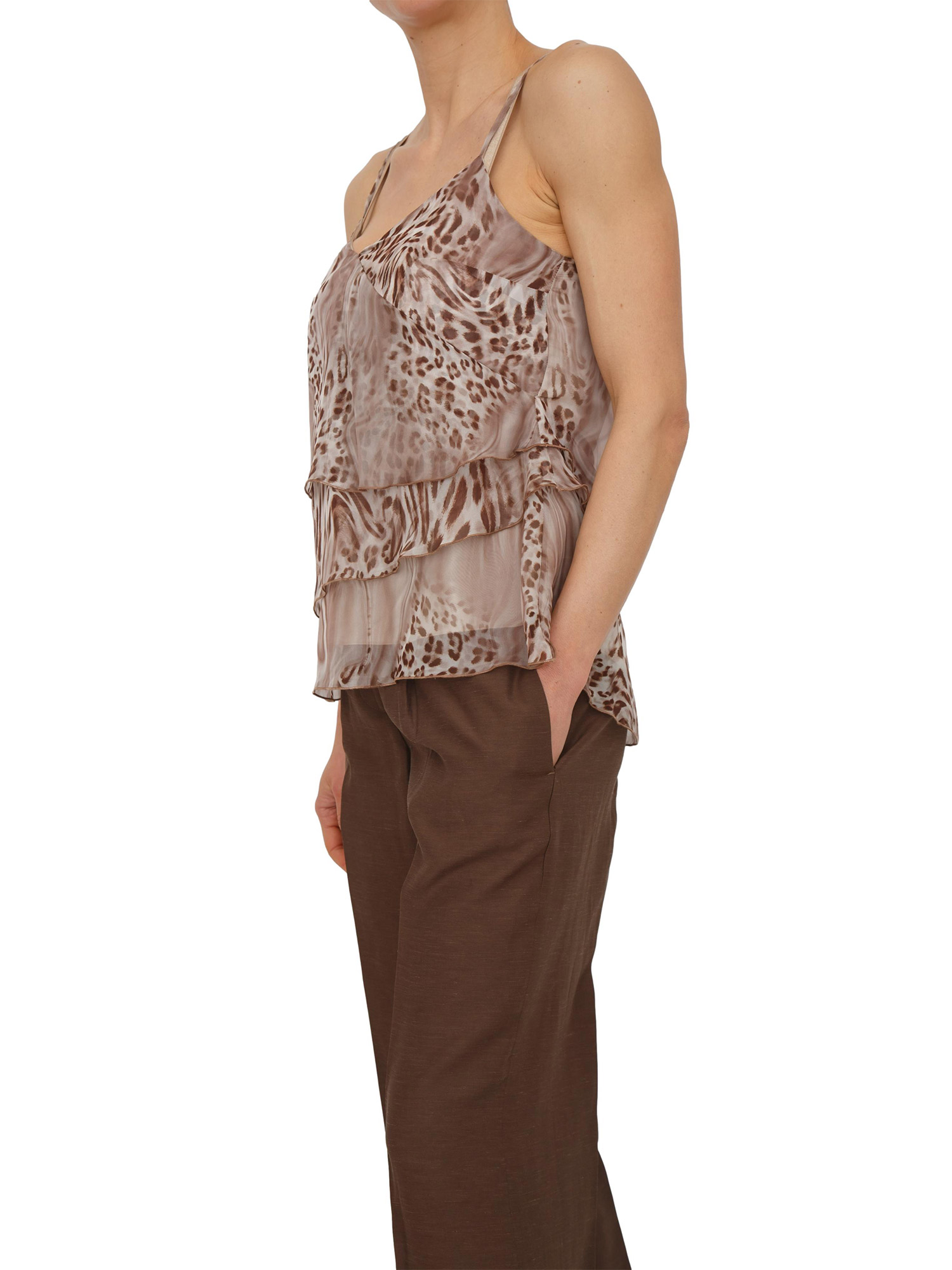 Dona una nota distintiva al tuo stile con il top Blugirl realizzato in chiffon animalier con giochi di grafiche e balze. Dotato di spalline sottili, scollatura a V, balze rifinite con filo e fodera. Perfetto come sottogiacca o come protagonista del look. La modella è alta 1.72 e indossa la taglia 38.