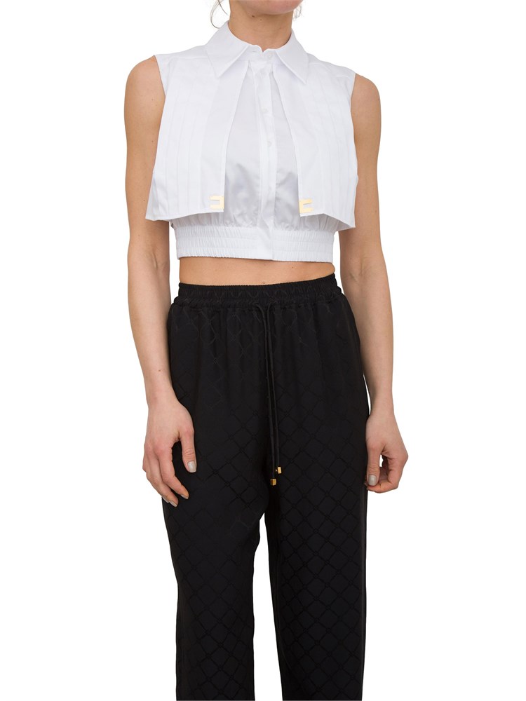 Camicia smanicata in popeline di cotone leggero con taglio cropped ed elastico al fondo. La costruzione a mantellina sul davanti richiama ai plastron ed è impreziosita da pieghettature e decorazioni con logo in metallo dorato. Vestibilità slim.La modella è alta 1.72 e indossa la taglia 40.