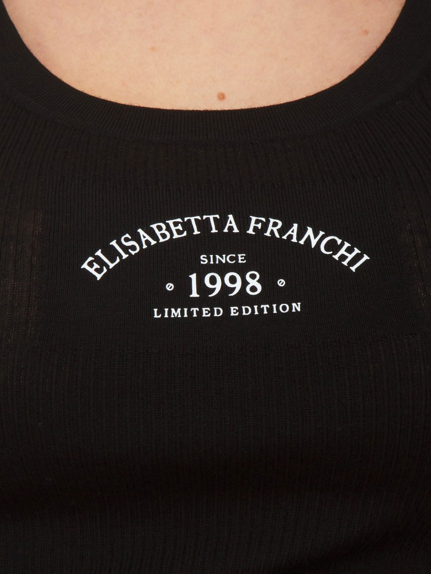 Top in maglia Elisabetta Franchi con scollo rotondo. Ha lavorazione a costine e si distingue per l'intarsio in maglia rasata dove compare la stampa con logo. Vestibilità aderente. La modella è alta 1.72 e indossa la taglia 40.