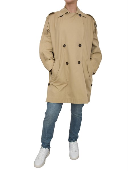 Trench passe-partout in gabardina di misto cotone abbinato a cintura con fibbia logo. Linea svasata, colletto, alamari sulle spalle, chiusura doppiopetto con bottoni logati, tasche con bottoni, bavolette e contropiega sul retro.La modella è alta 1.72 e indossa la taglia 40.