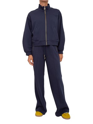 Tuta completa Twinset composta da felpa con zip dal fit regular e maniche a pallncino e pantaloni dal taglio dritto. La modella è alta 1.72 e indossa la taglia S.