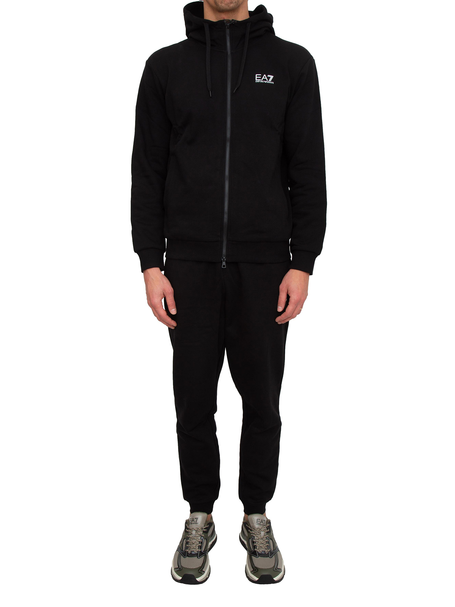 Tuta sportiva uomo EA7 Emporio Armani dalla linea pulita ed essenziale, caratterizzata dal piccolo logo a contrasto dai profili in maglia elasticizzata. Realizzata in morbido cotone, è perfetta per completare i tuoi look sportivi. Il modello è alto 1.90m e indossa la taglia L.
