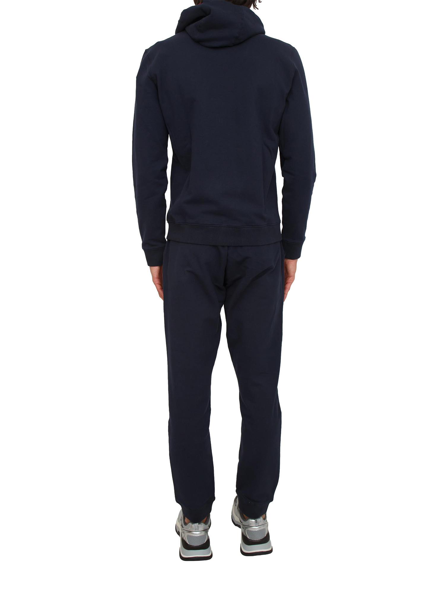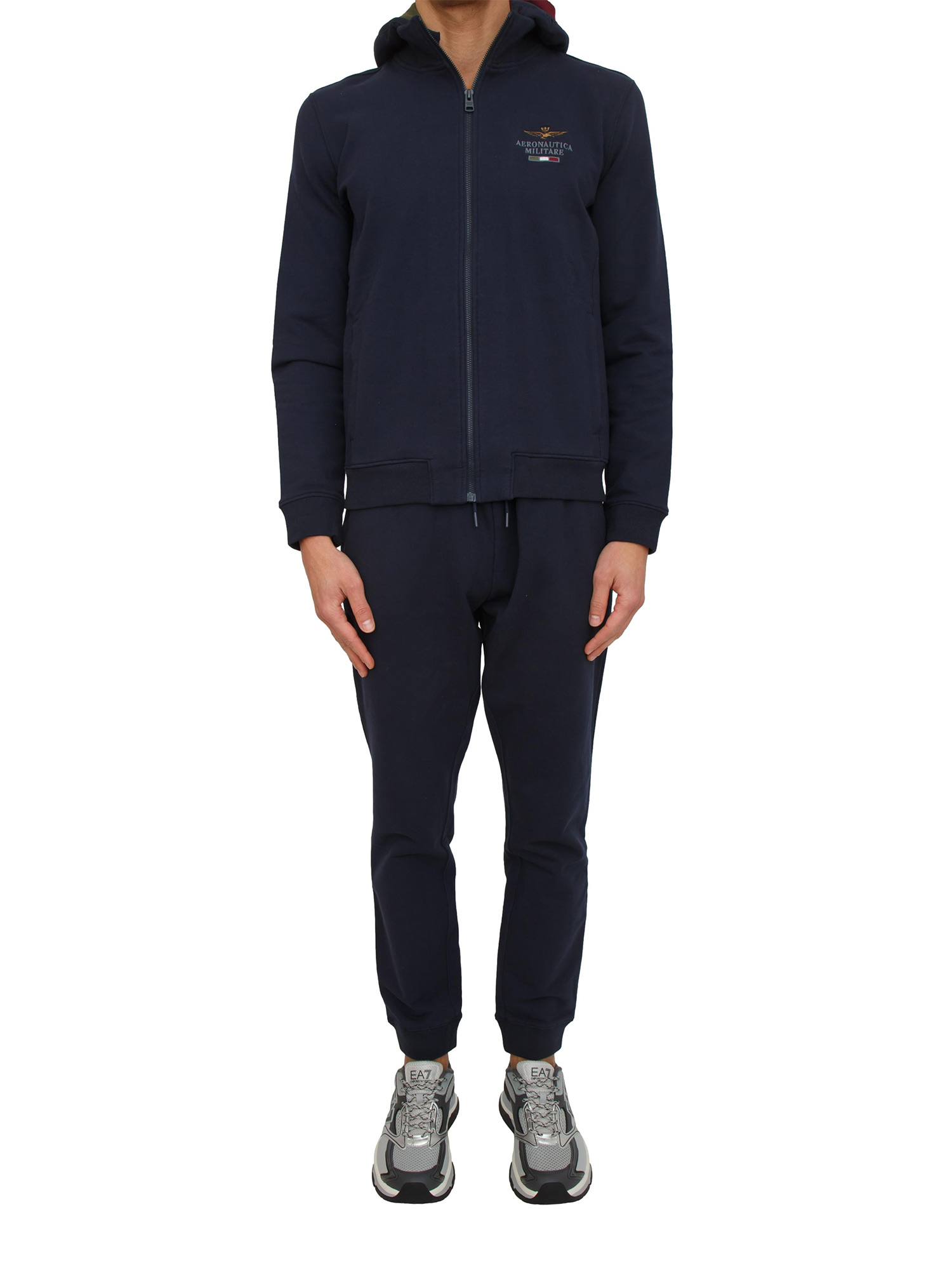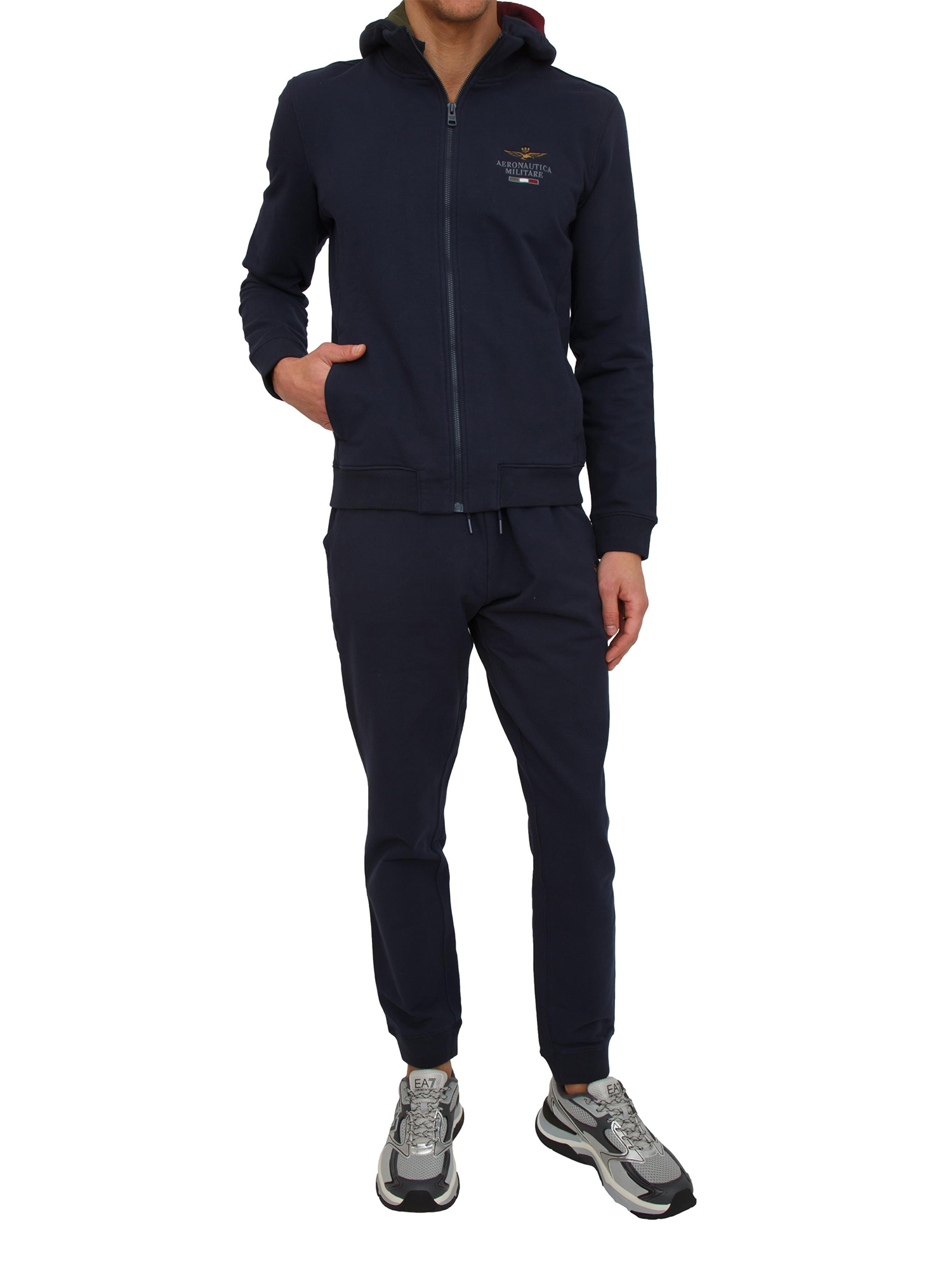 Tuta uomo, felpa e pantalone, firmata Aeronautica Militare realizzata in cotone blu con chiusura zip e logo sul petto. Dotata di cappuccio staccabile con fodera in cotone e stampa bandiera italiana. Il modello è alto 1.90m e indossa la taglia L.