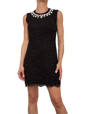 Due pezzi in uno per brillare di stile. Abito corto fitted in pizzo rebrodè smerlato con spalline regolabili, chiusura con zip al fianco e décolleté sagomato, abbinato a top lungo smanicato in jersey di cotone con ricamo di castoni e strass effetto collana. Aggiungi gli accessori e sei subito pronta. La modella è alta 1.72 e indossa la taglia 40.